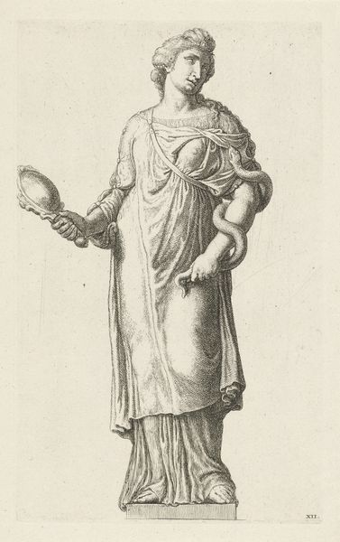 Curator: Here we have an engraving titled “Beeld van Temperantia (Gematigdheid) op de achtergevel van het Stadhuis op de Dam,” or “Statue of Temperance on the rear facade of the Town Hall on the Dam,” created between 1663 and 1783, after a design by Hubert Quellinus. It’s a delicate print, currently part of the Rijksmuseum's collection. Editor: My first thought is "restraint." There’s something so calmly powerful about her posture, the drape of the robes and how gently the artist handled line-work here. It speaks to moderation, definitely. Curator: Indeed. Quellinus’ Temperantia, a visual representation of the cardinal virtue of temperance, embodies self-control. The figure relates to Dutch notions of civic responsibility that are inseparable from global trade networks, which can be chaotic, inequitable, and produce extreme moral and social implications for marginalized populations in colonized territories. The figure is laden with meaning relating to intersectional discourses of power, control, gender, and economic models in 17th-century Dutch society. Editor: Notice the bridle in her left hand and the water jug in her right—classic symbols that denote Temperance in art across various cultures and time periods. It’s interesting to me how such distinct symbols continue to appear. Curator: Precisely! These enduring symbols underscore the notion of curbing excess, the controlled mixing of water with wine, the guidance and constraint offered by a bridle. Temperantia here is not merely an abstract virtue; it's about the moderation necessary for the smooth functioning of the republic, a theme interwoven with discussions about Dutch expansionism. This work provides the opportunity for viewers to examine social consciousness alongside its historical conditions. Editor: It really is amazing how potent these images are, how quickly they transmit an idea—in this case, the virtue of temperance and restraint. I find myself pondering what restraint looks like in our world today and who is in a position to practice such virtue. Curator: A question definitely worth considering. Reflecting on representations of virtues offers a crucial tool for analyzing complex power dynamics within the political landscape. It's so relevant when navigating current geopolitical crises, the resurgence of nationalist parties, and their effect on economic policies globally. Editor: This has definitely given me something to think about today, not just about the image but what it stands for culturally, its potency as an icon, its symbolism throughout time, and its importance to Dutch consciousness in the seventeenth century.