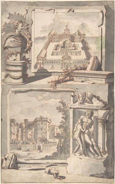 Curator: This is Jan Goeree's "A Reconstruction of the Temple of Divus Claudius in Monte Coelio (above) and a View of the Ruins (below)," dating roughly from 1690 to 1704. The piece combines drawing, etching, and engraving using ink. Editor: It evokes a melancholic atmosphere, a delicate dance between grandeur and decay. The monochrome palette enhances this feeling, creating a contemplative space. Curator: Indeed. Look at the contrast Goeree presents. The upper panel meticulously reconstructs the temple in its idealized form, a testament to classical architecture's enduring allure and human ingenuity. Editor: And the panel below shows us the real world, the temple as ruin, subject to the passage of time and the inevitable erosion of materials. The symbolic weight of that contrast—ambition versus reality—is compelling. What about the people populating these spaces? Curator: Ah, their presence gives the drawings scale, but it also underscores the Temple’s function. We see a lively public space becoming, in its ruined state, a sort of picturesque landscape. Their labor, the very act of building, has been superseded by commerce or leisure. Editor: I see them more as guardians or ghosts inhabiting sacred grounds. Consider that coin bearing a profile inserted to the right; such artifacts ground this in an intimate past, but are themselves, ironically, enduring symbols, perhaps more lasting than the physical structures they portray. Curator: That’s an interesting interpretation, focusing on individual tokens amidst collective ruin. To me, though, the emphasis is on the tangible traces left behind. How do we rebuild or, even, simply, accurately recall past endeavors? Goeree points to the partial survival of the physical structure as evidence. Editor: But the reconstructed Temple is not purely objective either, is it? The artistic rendering becomes a symbolic assertion, a commentary on cultural memory and our persistent attempts to restore what has been lost through destruction and historical circumstance. Curator: I agree that memory plays a crucial role, even as the material remnants dictate the form of the ideal. Perhaps it is the enduring artistic reproduction that conveys true historical import. Editor: Ultimately, it's that push and pull between material degradation and symbolic endurance that really grabs my attention. Curator: Yes, a constant negotiation we've been revisiting this entire time.
