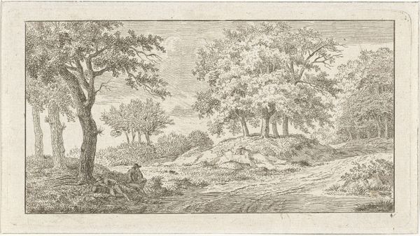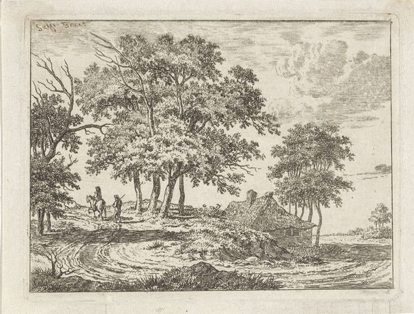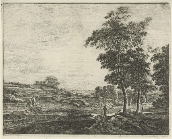 Editor: Here we have "Landscape with Shepherd and Sheep" created between 1637 and 1679 by Philips Augustijn Immenraet, currently residing here at the Rijksmuseum. It's an etching and, right away, I notice the light. There's such delicate detail with the sky. What compositional choices stand out to you? Curator: Observe the arrangement of forms: the large tree on the right, the flock of sheep and the tiny figure of the shepherd placed lower and closer, offset by the distant church and sky. How does this structure lead your eye across the image? Editor: It does create a flow...almost a circular movement starting with the dark, denser area and up toward the light clouds. The placement of that shepherd really emphasizes the landscape. Why make him so small, almost an afterthought? Curator: Consider how scale and relative proportions within the composition impact the pictorial balance. The artist guides our vision using contrasts—light and shadow, density and sparsity. What visual evidence suggests this is a meditation on space itself? Editor: So, not just about sheep, trees, and churches? The depth created by varying the hatching? Curator: Exactly. Notice how the artist uses subtle gradations to generate a feeling of depth and to invite contemplation. Are we observing or participating? Are we within this pictorial space, or simply apart from it? Editor: That's a great question! I’m so used to thinking about the "meaning" of the shepherd, I didn't even really consider how the marks and lines create a sense of spatial depth...thank you. Curator: A fruitful investigation.
