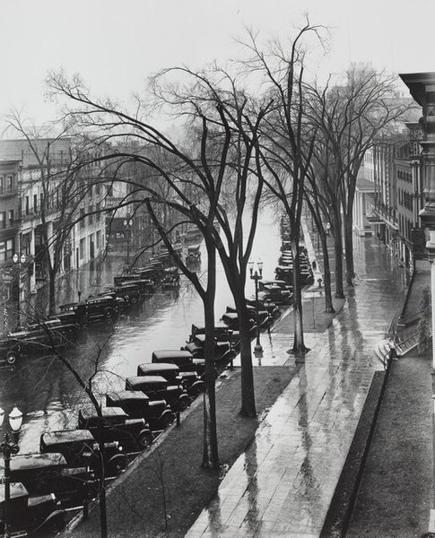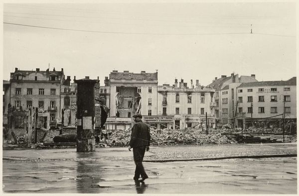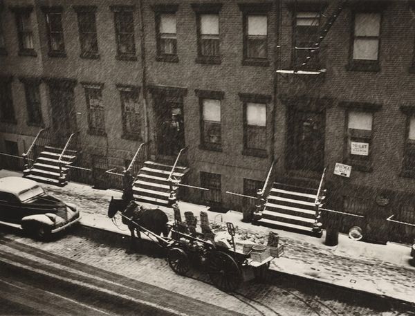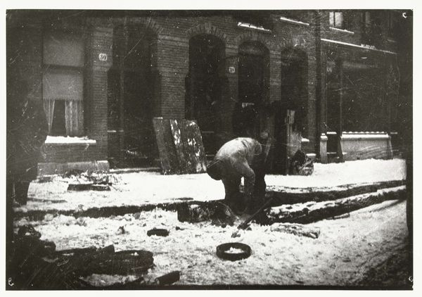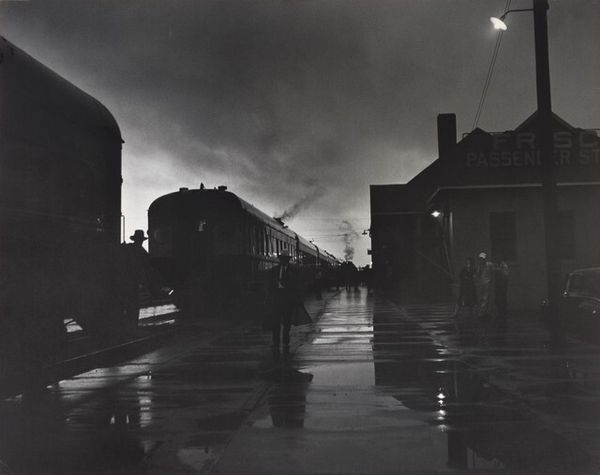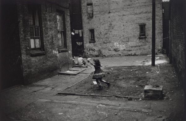Editor: So here we have Gordon Parks' "Boys with Raised Baseball Mitts, Chicago," from 1953, a gelatin-silver print. What strikes me most is the dynamic energy, contrasting with the rather gritty, urban backdrop. What do you see in this piece? Curator: The initial formal reading draws attention to the geometry created. Parks juxtaposes the spontaneous, upward thrust of the boys against the rigid, horizontal lines of the architecture. The puddle introduces a doubling, a visual rhyme that enhances the composition. Notice also the tonal range. Editor: Yes, the reflections in the puddle almost create an inverted world. It’s fascinating. Why emphasize these structural elements? Curator: Structure is the armature upon which the entire aesthetic experience rests. Parks employs contrast--between light and shadow, movement and stasis--to generate visual interest, guiding the eye throughout the composition. Semiotically, these structures are signifiers, cues to interpretation. Ask yourself what might those contrasting elements mean to the viewer? Editor: I guess it makes me think about the energy of youth against this…dour backdrop. The ephemeral moment, caught forever. Is it too much to read that in? Curator: No, I think you are onto something, the elements converge beautifully. I find I’m thinking about light and shadow, how it catches fleeting movements with lasting form. Editor: So interesting; thanks for sharing a completely different reading of the work. Curator: It has been my pleasure. Examining Parks’ strategy has given me new eyes to understand the piece more deeply.