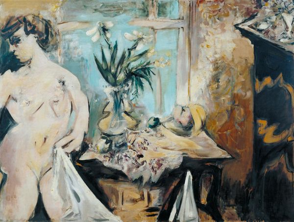 Editor: Right now, we're looking at Pierre Bonnard's "The Fireplace" from 1917. It's an oil painting, and it strikes me as intensely domestic, almost claustrophobic, but not in a bad way. The colors are so warm. How do you interpret this work? Curator: Oh, Bonnard… he invites us into such private moments, doesn't he? I see a layered intimacy here. The nude figure, slightly obscured, framed within the larger setting of the room. It’s not just a woman, it's an atmosphere. The "Fireplace" becomes a stage for his introspective musings on everyday life, colored by memory and imagination, really. Editor: A stage, that’s interesting! The colors and almost hazy brushstrokes do create a dreamlike quality. Is that intentional? Curator: I think so. Bonnard was associated with the Nabis, who felt art shouldn't slavishly represent the external world. For them, it was all about subjective experience. So the hazy brushstrokes, the slightly skewed perspective… these are tools he's using to convey a feeling, an impression, rather than photographic realism. Do you feel that the intimate, the seemingly commonplace elevates the woman's gaze, her very being into one of mythic quality, transforming daily life into a transcendent vision, echoing the artist's soul? Editor: That's a powerful reading. I initially saw it as simple, but I get it, the composition directs my attention, encouraging this reading of significance within these muted familiar spaces. Curator: Exactly! It's a quiet revolution. Bonnard took the ordinary and revealed its extraordinary essence. This seemingly simple fireplace scene becomes a portal into his unique, deeply personal world, one where feeling and sensation reign supreme. Isn't it magical, the way art can do that? Editor: Definitely. It’s amazing how much more there is to see when you dig a little deeper, even in a "simple" scene. Curator: Yes. These everyday glimpses through the windows and rooms show that inspiration may lie in that ordinary moment that unexpectedly sparks with insight. A constant beacon.