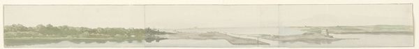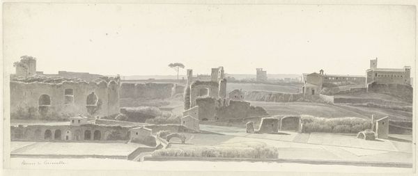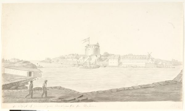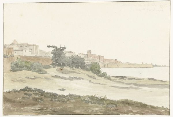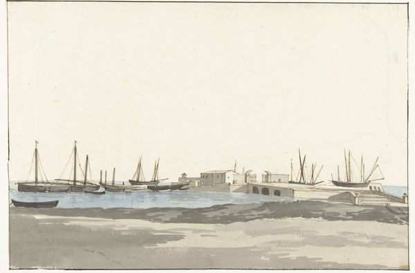 Editor: So, this watercolor by Louis Ducros, “View of the Castle in the Harbor of Barletta,” from 1778…it’s a really serene cityscape. The colors are muted, almost washed out, but it has this peaceful, timeless quality. What jumps out at you? Curator: It speaks volumes about the 18th-century's fascination with the picturesque, doesn’t it? These views, carefully composed, served as souvenirs, but also reinforced a certain power dynamic. This wasn't just a depiction of Barletta; it was a *performance* of observation, framing the town for a privileged audience. Consider who was commissioning these works. Editor: The wealthy travelers doing the Grand Tour, right? Curator: Exactly. And what are they taking away? Not the grit of daily life, but an idealized vision, mediated by Ducros's brush and their own expectations. How does the image perpetuate ideas of the region? Editor: I guess it presents Barletta as safe, historic, worth visiting, but maybe also somewhat...stagnant? Removed from the "important" events happening elsewhere? Curator: Precisely. And the architectural detail, while seemingly objective, emphasizes the control, the fortifications. Notice how nature is subservient to architecture and serves as the frame to the built structure in this "peaceful" watercolor illustration. It makes one wonder about the purpose of making such landscape during a period of societal tensions. Editor: That's a really interesting point. It's like, even in this calm watercolor, there's a subtle political message. I didn’t consider that, that art is embedded with so much social meaning. Curator: Absolutely! It makes you see these seemingly simple landscapes in a completely new way.
