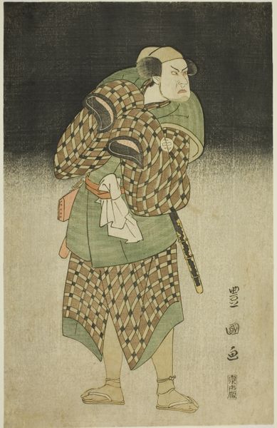Editor: This striking print, created around 1789 by Katsukawa Shunsen, depicts the actor Yamashita Mangiku I. It’s supposedly in the role of Lady Yuya, maybe from a play called Heike Hyobanki. I find it incredibly elegant, the way the bamboo echoes both in the hanging branch and on her kimono. What’s your take on this artwork? Curator: It’s more than elegant, it’s a wink and a nudge! Remember ukiyo-e prints weren't just for decoration, they were pop culture. These actor portraits were like celebrity endorsements. And Shunsen? He's having fun! See how he exaggerates the actor's features? It's almost caricature, yet respectful. A delicate balancing act, wouldn't you agree? Think of it like an early form of a star-is-born narrative; an image sold for fandom. Editor: I see what you mean about the celebrity angle. So, the bamboo – is that just a decorative motif, or does it carry extra meaning? Curator: Oh, nothing in these prints is *just* decorative. Bamboo represents resilience, flexibility. Maybe a comment on the actor's ability to transform, bend into different roles? Or maybe the artist saw it as strength; or simply it was for stage and effect. What if it's all a trick on the eyes and there are two different kimonos: a stage kimono and the one she is perhaps seen wearing? That's what great art allows us to ponder, I think. Editor: That’s fascinating! So much more to it than just a pretty picture. Thanks for that perspective! Curator: My pleasure! It is funny isn't it: once you get past that ‘pretty picture’, there are worlds opening up before you. I almost want to say, "Do you copy?" - and maybe one day we will enter it all.