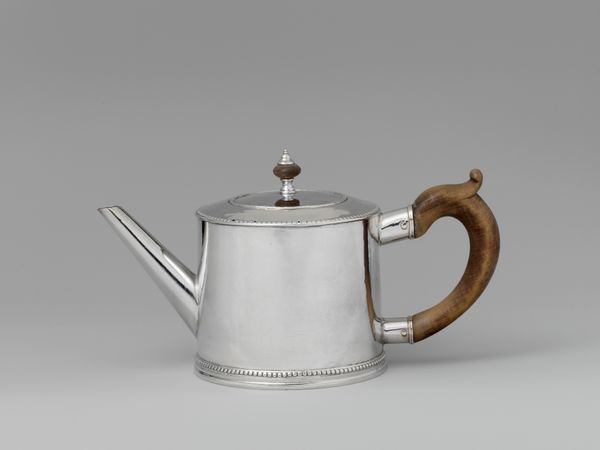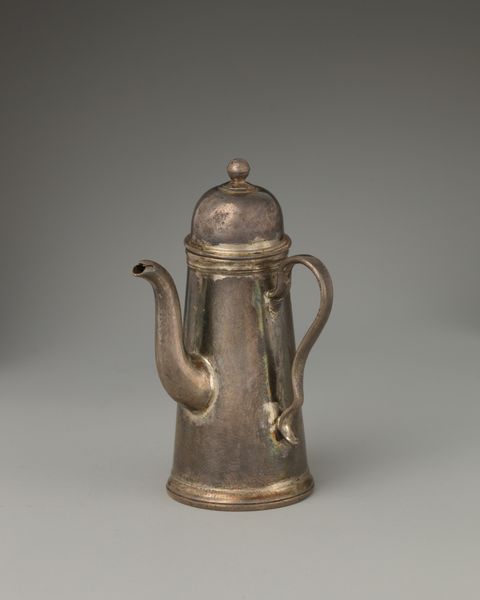Curator: Well, here we have an utterly charming object. It’s a miniature watering can, dating from between 1715 and 1735, made of silver. It currently resides at the Metropolitan Museum of Art. Editor: It looks like something a fairy godmother would use, doesn’t it? All that gleaming silver! Instantly brings to mind magical gardens and hidden spells for thriving seedlings. Curator: Exactly! Beyond its obvious use, the watering can carries with it profound symbolic associations of nurturing, growth, and care. Its miniature size amplifies these associations, representing the power found within small, diligent acts. The materiality, in this case the use of silver, speaks volumes about status and the appreciation for beauty during the period in which it was crafted. Editor: And the silver itself isn’t just a show of status; it reflects light so beautifully. It's hard not to associate light with hope and growth. Makes me wonder, was this a gift, maybe for a child to cultivate an appreciation for nature, or a lover reminding their partner that love requires attention and consistent effort to grow? Curator: That’s certainly possible! Garden imagery, and implements like this one, held immense symbolic weight, particularly when presented as gifts. This little watering can might reference the "garden of love," reflecting themes of devotion, growth, and the careful cultivation of relationships. Editor: Hmm. I wonder if a child received it; did it encourage her to cultivate something new? Or even prompt a love for tiny, magical acts? A silver watering can is, admittedly, more enchanting than plastic. Curator: The craftsmanship itself embodies a unique form of symbolic language, suggesting an enduring appreciation for everyday acts when infused with intention and care. It is more than a garden implement; it encapsulates hope, memory, and the careful nurturing of possibilities, all concentrated within this gleaming silver. Editor: True. I get this lovely impression of patience from it. A slow kind of nurturing that trusts time and attentiveness. It truly transcends being just a small metal container with a spout. Curator: I quite agree! It seems that even small objects like this can reflect some universal values back at us.