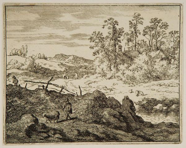 Allart van Everdingen created "The Shepherd and the Lamb" using etching, a printmaking technique that democratized image production. The process begins with a metal plate, usually copper, coated with a waxy ground. The artist then draws through this ground with a needle, exposing the metal. When the plate is immersed in acid, the exposed lines are bitten, creating grooves. Ink is applied to the plate, filling these grooves, and the surface is wiped clean. Finally, paper is pressed against the plate, transferring the ink and creating the print. Look closely, and you can see how Everdingen used different densities of lines to create light and shadow. The etched line has a unique character, a kind of controlled roughness, quite distinct from a drawn line. The beauty of etching lies in its reproducibility; many impressions can be pulled from a single plate. This made images like "The Shepherd and the Lamb" accessible to a broad audience, influencing popular taste and understanding of pastoral life. It blurs the boundaries between art, craft, and industry, and is a testament to the power of accessible image-making.