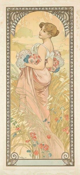 Alphonse Mucha crafted this image in the Art Nouveau style, distinguished by its decorative elegance and flowing lines. Note how Mucha uses a muted palette of pastel colors, where soft greens, pinks, and creams blend seamlessly to create a serene, almost ethereal atmosphere. The composition is dominated by a sinuous, vertical figure draped in flowing fabric that subtly reveals the contours of her body. The delicate lines and intricate details, especially in the swirling background patterns and the snowy branches, emphasize the decorative aspect characteristic of Art Nouveau. Looking closely, the overall effect is one of idealized beauty, characteristic of fin-de-siècle aesthetics which embraces symbolism through natural and feminine forms. This image's careful structure offers a formal interplay between the figure and the surrounding natural elements, typical of Mucha’s decorative style. The way the artist constructs the scene reflects a broader artistic and philosophical interest in capturing the ephemeral and the ideal.