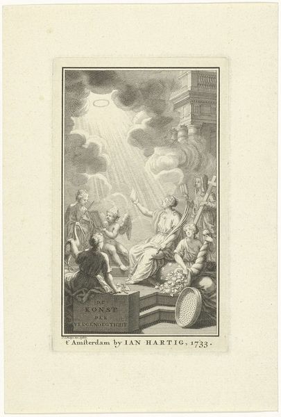 Curator: What strikes you first about this image, “Saul at the Witch of Endor,” an engraving from 1766 by Simon Fokke? Editor: The sheer drama! The light and shadow, the figures contorted in fear... it feels like a stage set for a nightmare. The ghostly apparition rising from the smoke is especially unnerving. Curator: Indeed. Fokke expertly uses the line technique of engraving to build incredible tension, doesn't he? It's an illustration of a specific moment, drawn from the Books of Samuel. We are witnessing Saul, the King of Israel, consulting a witch in disguise. Samuel, the prophet, had died, and the biblical narrative frames it as Saul secretly sought a medium to summon Samuel’s spirit to ask advice about an impending battle with the Philistines. Editor: The summoning of the dead... always a potent symbol. What strikes me is how universally it resonates. The anxiety about the future, the desire to know what's coming – that’s embedded deep in human culture. The figure of Saul almost pleading in the lower corner really captures a primal desire. Curator: This work speaks volumes about the visual culture of its time as well. The narrative art of the Baroque, of which this engraving exhibits several traits, sought to illustrate religious and historical tales, to make moral points within contemporary sociopolitical dynamics. Consider the composition – everything pulls our eye toward the central apparition, highlighting the gravity of defying divine law for short term security. Editor: And the shadowy figures in the tent behind the witch – are those demons, or simply the product of Saul's terrified imagination? Either way, the image conveys a real sense of transgression, of boundaries being crossed. Curator: These iconographic representations became increasingly complex and stylized, and the interpretation would surely have evolved, yet images like this helped maintain the religious and political frameworks that characterized the Netherlands. Editor: Knowing the context makes it all the more powerful. Fokke captured more than just a biblical scene, the symbolic anxieties regarding political stability. I'm leaving this piece contemplating the delicate line between power, desperation, and the enduring allure of the forbidden. Curator: For me, seeing it reveals a compelling glimpse into the religious storytelling and imagery that pervaded society at that moment in the 18th century.
