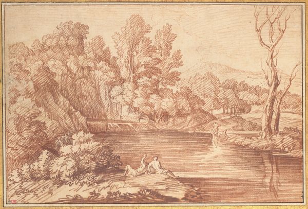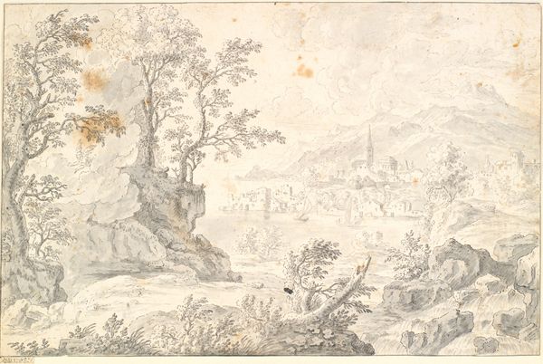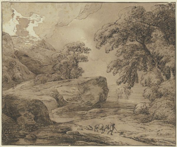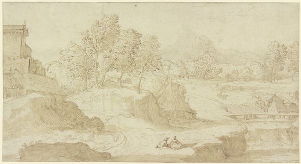 Curator: Welcome! Today, we'll be exploring a drawing titled "Berglandschap met twee figuren op een smalle brug" attributed to Pieter Dircksz Santvoort, created sometime between 1615 and 1653. It’s rendered in ink. Editor: It strikes me as quite serene, almost dreamlike. The limited palette certainly contributes, lending a sense of faded memory. What catches my eye is the delicate line work contrasted against these broad washes. Curator: Yes, that contrast is important. There is a symbolic weight to the use of seemingly humble materials. Santvoort has achieved such detailed rendering, using basic drawing materials, with an undeniable emotional presence that speaks volumes about man's connection with the sublime landscape. The bridge is small but clearly supports two figures, seemingly undisturbed amidst the grandeur of nature. Editor: I agree. There's definitely an element of drama even in this small format, given the contrasts between the monumental landscape and these two figures carefully navigating that very precarious little bridge, suspended above what looks like a raging stream. One gets a sense of the raw energy harnessed through rudimentary, accessible materials like paper and ink. I’m interested in the type of ink he employed – was it easily sourced, impacting his design choices through limiting colour gradients? Was this choice driven by pure aesthetic sensibility, perhaps a focus on linear depiction over tonal detail? Curator: Those are compelling questions and reflect well the impact the medium had. The limited use of colour is deliberate, emphasizing clarity, rather than illusion. Think of what landscapes represent during the Baroque: reflections on mortality and transcendence, invitations to contemplate God's creation. This vista inspires feelings, acting like metaphors and memories, speaking to cultural perceptions of nature, which he distills with a minimal use of colour. Editor: Exactly. It goes beyond mere representation. I wonder if this work served as a preparatory sketch or holds standalone merit as a statement. Is it part of his larger production process, documenting or perhaps commenting on the transformation of physical resources by communities in a changing landscape? It would be very enlightening to uncover what sort of labor and materials formed that bridge, juxtaposed next to our present view of the artistic process! Curator: Such details would certainly add layers to our understanding! Ultimately, the drawing offers a potent meditation on transience within an awe-inspiring natural order. Editor: I appreciate the chance to reflect upon the simplicity of form contrasted alongside a potent rendering of grand scenes crafted with economical means. It calls to mind questions about material consumption and our relationship with the surrounding landscape in past eras as well as today.