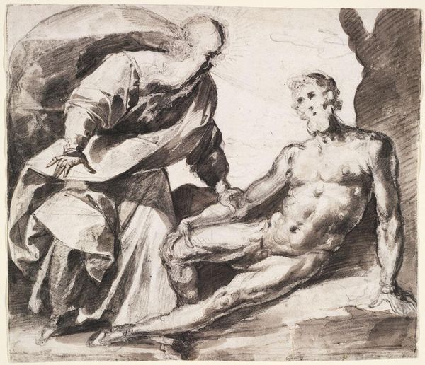 Editor: This is Willem Panneels' "Pythagoras of Samos(?)," created between 1628 and 1630. It's a drawing, using pencil, currently held at the SMK in Copenhagen. The figures seem to be emerging from the background; it's so dynamic. What stands out to you most about this sketch? Curator: The dynamism you notice speaks volumes. Panneels seems to capture not just likeness but the very *idea* of Pythagoras. Notice the drapery – it swirls and flows, almost alive. What does that choice of depiction convey to you? How does the looseness and sketch-like feel relate to the image itself? Editor: I see... it's not just a static portrait. The fluidity gives it a sense of ongoing thought and discovery. The way the lines aren't fully defined also makes it feel like a work in progress – perfect for representing a philosopher constantly seeking knowledge. What do you think of that open interpretation? Curator: Precisely. And consider the slight vagueness around his identity: "Pythagoras of Samos(?)." This signals the Renaissance fascination with classical figures, often pieced together from fragmented accounts. Do you get a sense of Panneels using Pythagoras' established persona, such as that of a teacher and numerologist, in any recognizable forms, either direct or metaphorical? Editor: Hmm, not directly... I am trying to view this using everything that has been discussed, and even what has not been overtly explored. It certainly has offered some new viewpoints on what otherwise would be a simple character study of a historical figure! Curator: And therein lies its power! It encapsulates the Renaissance's re-engagement with classical thought and hints to the endless pursuit of knowledge through inquiry and representation.