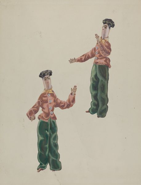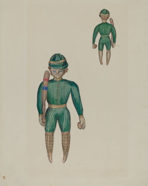 Curator: Here we have "Knitted Doll 'Duke'," a watercolor and drawing piece created around 1937 by Verna Tallman. It captures the essence of folk art with its simplicity. What are your first impressions? Editor: My immediate thought is about how this small, unassuming drawing evokes a melancholic sense. The doll's expression is so… vacant, yet those colors are quite vibrant. The texture implied by the watercolor mimicking knitted material adds another layer. Curator: The doll depicted is indeed interesting. We have to consider the historical context: such objects can carry the weight of their time, potentially reflecting societal roles or even colonial undertones, considering how handmade objects and children's playthings were imbued with complex cultural narratives. The title 'Duke', especially, raises questions of status and performance of identity. Editor: I'm also curious about the figure repeated in the background. Could this imply some form of memory, or perhaps it echoes through time? What cultural memories might be embedded within this figure that the artist wants us to consider? Curator: That is a key point. The artist places that memory next to a potentially more present image. The formal dress could even reference a romanticized colonial past. What are we to make of this knitted "Duke"? What power dynamics are in play within his context, then and perhaps even now? Editor: It also sparks reflection on material culture itself. The simple knitted construction against the formal costume—is this tension an attempt to subvert or to uphold certain ideas or systems of power? Curator: Perhaps both. Its visual components are undoubtedly charged, so it provides rich avenues to explore intersecting themes of identity and heritage, revealing nuances of cultural experiences and offering glimpses into a particular historical moment. Editor: It shows us that even seemingly innocent objects carry heavy cultural meaning and deserve further scrutiny. Thanks for untangling that a little. Curator: Thank you. Looking more closely always gives you greater insight into our history.