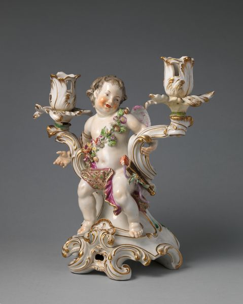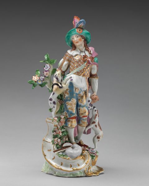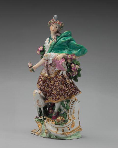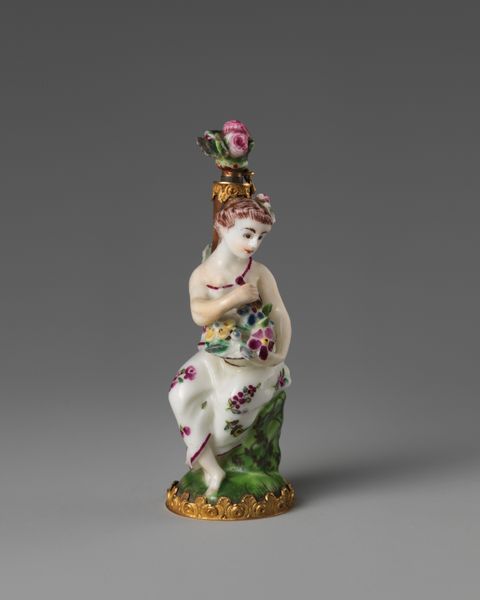 Editor: This delightful porcelain sculpture, "Lady seated amongst a grapevine," was crafted sometime between 1745 and 1760 by the Saint James's Factory. Its delicate details and playful Rococo style give it an air of lighthearted elegance. What symbolic meaning do you find woven into this piece? Curator: Look at how the grapevine motif is handled. In classical iconography, the vine has long been linked to Dionysus, or Bacchus, god of wine, ecstasy, and fertility. This ceramic captures this joyful abundance. Observe how the artist positions a bird above her; what does this imagery tell us? Editor: Perhaps that the bird represents freedom, or the soul? It seems elevated, separate from the earthly figure. Curator: Precisely! Bird symbolism, depending on species and culture, embodies spirituality and transcendence. Also note how genre painting became incredibly popular, depicting scenes from everyday life during that time. Do you think that the figure depicts some form of celebration, like the Bacchic festivals? Editor: That's interesting... her attire, while refined, isn't overly elaborate, suggesting a celebration amongst everyday citizens, perhaps? The artist seems to blend classical and contemporary references. Curator: It is quite the intersection! Also consider how these figurines functioned within the domestic sphere, perhaps on mantle pieces, or within cabinets of curiosities, suggesting their owners took part in the Enlightenment and new attitudes towards nature. This piece serves as a touchstone to an array of fascinating concepts of this time period! Editor: It's amazing how much historical and cultural meaning can be contained within what appears to be a simple decorative object. I'll definitely view porcelain figurines in a new light now. Curator: Indeed, imagery speaks across centuries. This was a delightful discovery for both of us.