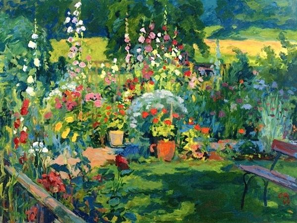 Pyotr Konchalovsky painted Children in the Park with oil on canvas using bold, expressive brushstrokes and a vibrant color palette. You can almost feel the thick impasto, a kind of juicy layering that really makes the painting sing. The texture is so tangible, as if you could reach out and touch the petals of the flowers or the rough bark of the trees. Look closely at the pink blossoms; each dab of paint is like a little explosion of color. This isn't just about depicting a scene; it's about capturing the energy and liveliness of a summer day. Konchalovsky reminds me of Van Gogh, who also used paint to express emotion, though maybe with a slightly more romantic sensibility. Ultimately, it's the ambiguity of these works that makes them so compelling – there's no single right way to see or interpret them, and that's what keeps us coming back for more.