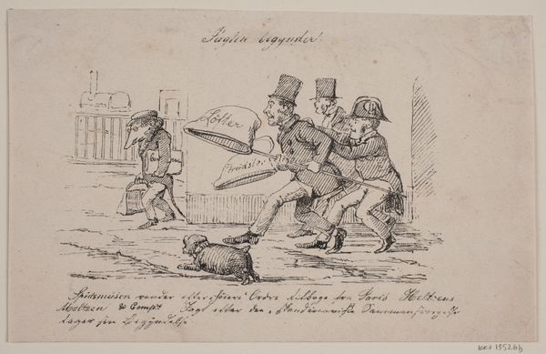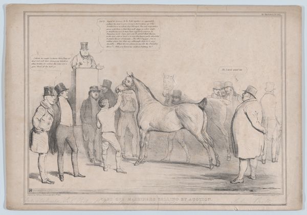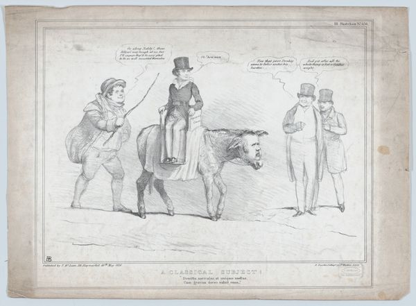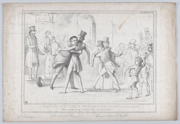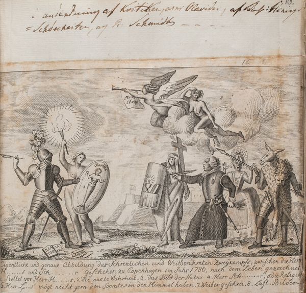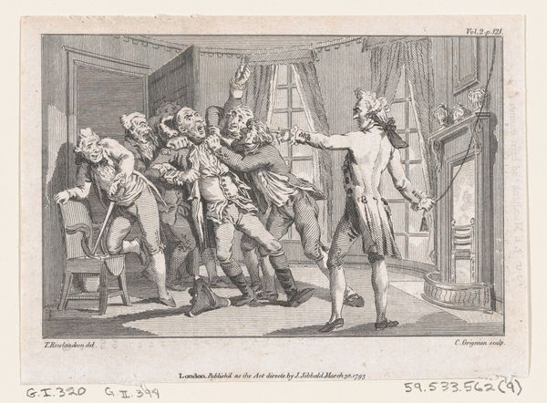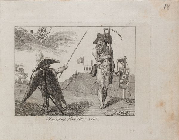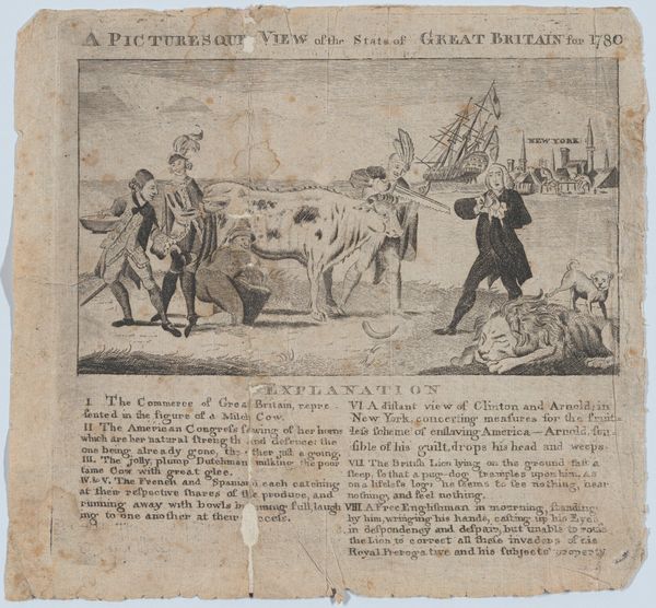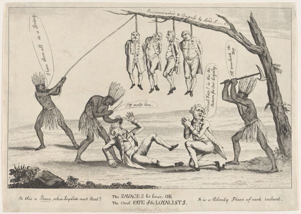 Curator: Let's consider this print now in front of us. Created around 1782 by Thomas Colley, it's titled "The Reconciliation between Britannia and her Daughter America." Editor: Well, immediately the conflicting visual elements overwhelm—a bizarre composition, really. The allegorical figures almost seem caught in a tug-of-war, their limbs akimbo and expressions…strained. Curator: Absolutely. Colley situates this work within the aftermath of the American Revolutionary War. Through caricature, the print is steeped in the political and social climate. Look closely, and we see a convergence of identity and fraught allegiances: Britannia embracing America, with others seemingly trying to pull them apart. It serves as visual commentary on nationhood, family, and reconciliation in a moment of deep ideological divide. Editor: Focusing on pure design, it’s chaos! Notice how Colley’s deployment of line dictates the mood of disarray, there is no organization to the elements in the composition—it feels incredibly imbalanced. The characters tug on the allegorical figures, each interaction points to another part of the picture plane. It makes your eye jump everywhere. The artist attempts to convey stability and reunion, and falls incredibly short. Curator: Indeed. But this speaks volumes about the societal pressures, right? The "Dutch" character lurking in the background, with his “Dutch Rumms” barrel, France and Spain vying for influence... they embody European meddling. Even the Native American figure representing America’s indigenous people hints at layers of complicated negotiations that preceded this so-called reconciliation. Colley’s art holds space for each nation, to each culture impacted by war and displacement. Editor: If you examine Britannia's shield, the inscription “George for Ever,” indicates the print is still largely sympathetic to the Crown despite its ostensible message of reunion, though America wields the pole marked 'liberty' – these elements indicate underlying sympathies within the structure of Colley’s composition. He might say he's pushing for "peace," but his rendering of forms betrays those colonial ties! Curator: An interesting, even provocative, reading that underscores how visual language reveals the intricacies of political sentiment. It urges us to confront the uncomfortable fact that "reconciliation" might well obscure continued oppression. Editor: Precisely. There’s real power in observing those subtleties and recognizing the aesthetic mechanics embedded in this so-called image of peace.