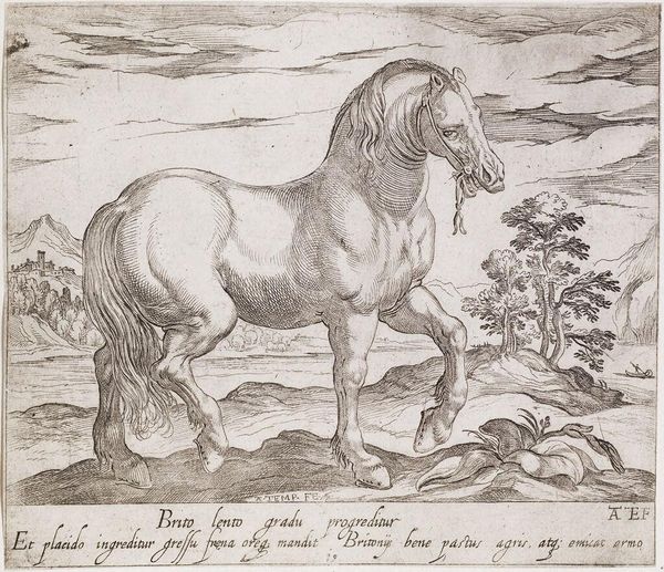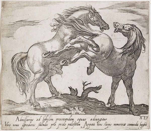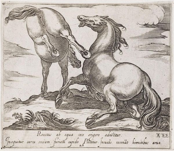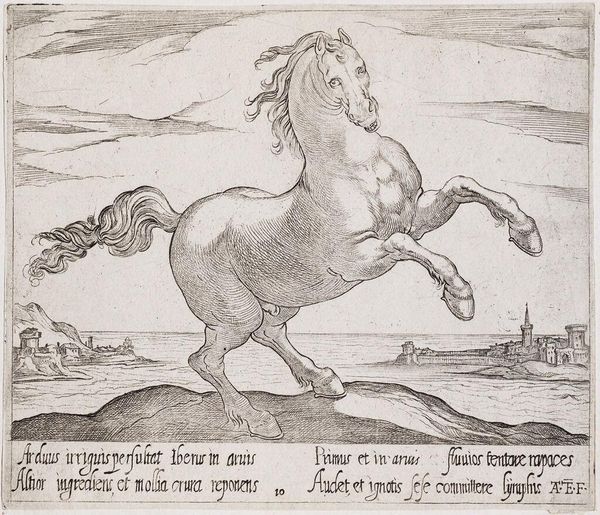 Curator: This is Antonio Tempesta's "A Rearing Horse, Facing Right," held here at the Harvard Art Museums. Editor: It's quite dramatic! The rearing pose and intricate linework give it a palpable sense of contained power. Curator: Tempesta, active in the late 16th and early 17th centuries, was known for his battle scenes and animal studies. Horses, particularly, were symbolic of power and nobility. Editor: Note the exquisite detail in the musculature and the mane. The engraving technique really captures the texture. But I can't shake off the fact that it looks like the horse is about to fall. Curator: Perhaps! It speaks to the precarious nature of power, especially during the turbulent times Tempesta lived through. The horse, although strong, is presented in an unstable position. Editor: A fitting parallel, I suppose. It is a visual dance of energy and tension, a story of movement. Curator: A story of the times!