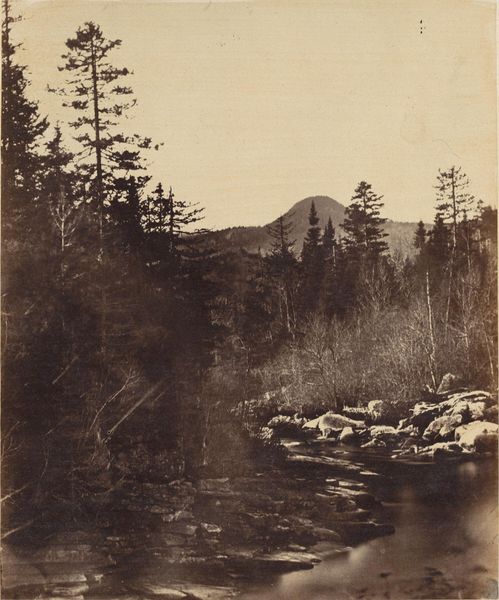 Editor: Here we have William Henry Jackson’s “Westzijde van Eagle River Canyon in Colorado,” an albumen print dating somewhere between 1860 and 1900. I find it quite evocative—it has this real sense of scale and wildness, despite its relatively small size. What do you see in this piece? Curator: I see a dreamscape, or maybe a memory. That soft-focus river feels almost like a flowing ribbon of time, doesn’t it? It really reminds me of the Hudson River School painters—they had a way of idealizing nature, didn’t they, capturing it just as the wild west was facing down modern America. This canyon feels caught between those worlds, between something being remembered, and something becoming… Editor: Like a time capsule? Curator: Exactly! The textures—the rocky slopes, the stark trees—it's like Jackson is showing us the very bones of the continent. Have you ever felt that when you're really in the wilderness? Editor: Definitely. A sense of ancient, almost geological time. And a kind of lonely beauty. Curator: Beautifully put. That albumen print gives it that almost sepia-toned sense of history as well. He wanted you to feel like you were THERE. He trekked across the country. A little dramatic license here and there to catch the viewers, but very brave. So I'm curious: what does this 'wildness' actually tell *you*? Editor: It makes me think about preservation. Of both land and memory. Curator: And it asks you the crucial question, right? What wilderness can we find, that we keep and preserve for our children?