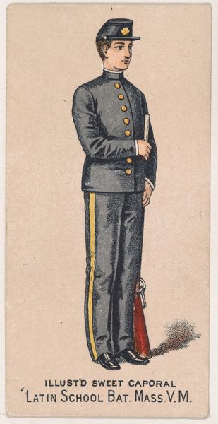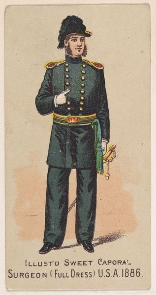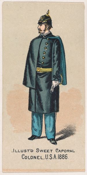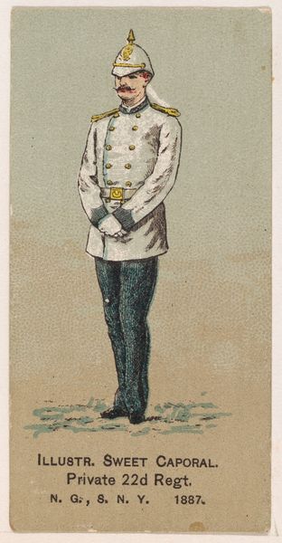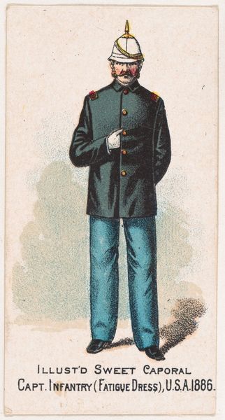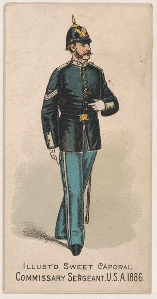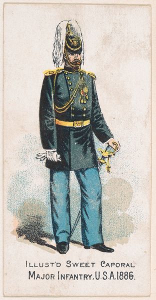 This chromolithograph of an Assistant Inspector-General of the United States Army was issued in 1886 by the Kinney Tobacco Company as a promotional item for Sweet Caporal Cigarettes. The figure, resplendent in a dark blue uniform with gold trim, embodies the renewed emphasis on military professionalism in post-Civil War America. We see the visual codes of hierarchy and power through the officer's upright posture, the meticulously detailed uniform, and the saber at his side. The image was made during a period of institutional reform within the U.S. Army, influenced by European military models, particularly Prussian. The army sought to improve its training, organization, and technological capabilities. Cigarette cards like these reflect an effort to cultivate a sense of national pride and project an image of strength and order. As historians, we can look to military archives, newspapers, and popular culture of the time to understand the values and anxieties of the era. By understanding the social and institutional context, we can better appreciate the meanings embedded in this seemingly simple image.