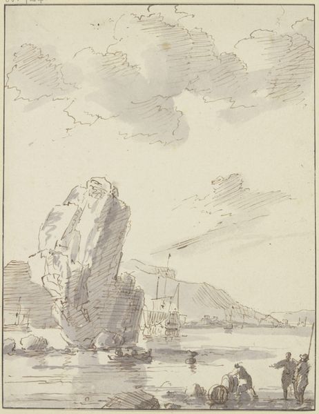 Editor: Here we have an ink and paper drawing titled "Strand, vorne links ein Herr und eine Dame, daneben drei andere Figuren, rechts drei Segelboote" which translates to "Beach, a gentleman and a lady in the front left, next to them three other figures, three sailboats on the right." It is attributed to Ludolf Backhuysen and resides in the Städel Museum collection. What do you see in this drawing? Curator: Well, considering Backhuysen’s social context, the availability of materials plays a huge role. Look at the relative affordability of ink and paper during the baroque period, and how this would enable preliminary sketches like these in preparation for larger works. I’m also drawn to the landscape subject of the image and the tools Backhuysen used. Editor: It's amazing how such simple materials could portray a scene of such apparent luxury – people enjoying leisure time by the sea, sailing ships... Curator: Exactly. Think about the economic infrastructure that made this scene possible. Those figures on the beach: who produced the clothing they wore? Where were those ships constructed, and who provided the labor and materials? A scene that presents itself as one of casual pleasure rests on vast structures of production and consumption. Editor: So you're saying that even in a simple sketch, the means of production leave their mark? Curator: Absolutely. Backhuysen, though part of a society where the distinction between high art and craft existed, offers a fascinating view of the labor connected to creating not only his art but also the context in which his artwork appears. Editor: I hadn't considered all of the economic factors represented in such a quick sketch. Thank you for showing me this material side of the work. Curator: Indeed. It pushes us to ask further questions, what about the availability and the costs associated with trade influencing this seascape as a sought-after style.