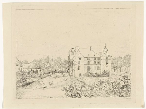 Here is an etching by Reinierus Albertus Ludovicus baron van Isendoorn à Blois, depicting a side view of Cannenburch Castle with houses near the entrance bridge. Though undated, we know it was made sometime between 1786 and 1856. Van Isendoorn à Blois, a baron himself, presents us with a serene, almost idyllic view of aristocratic life. The castle, rendered with meticulous detail, stands as a symbol of power and privilege, reflected in the calm waters surrounding it. Yet, this image exists within a complex historical context. The late 18th and early 19th centuries were marked by significant social and political upheaval, including the rise of democratic ideals challenging the old aristocratic order. While seemingly detached, this artwork subtly reinforces a particular social hierarchy and idealizes a lifestyle increasingly under scrutiny. The choice to depict the castle from a distance, framed by lush greenery and tranquil waters, evokes a sense of romanticism, perhaps yearning for a bygone era. What do you feel when you look at this image?