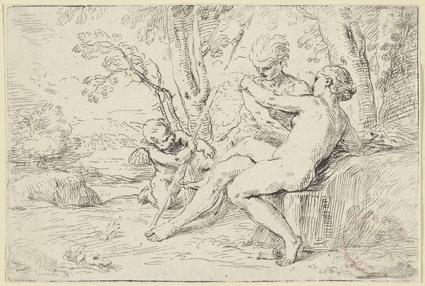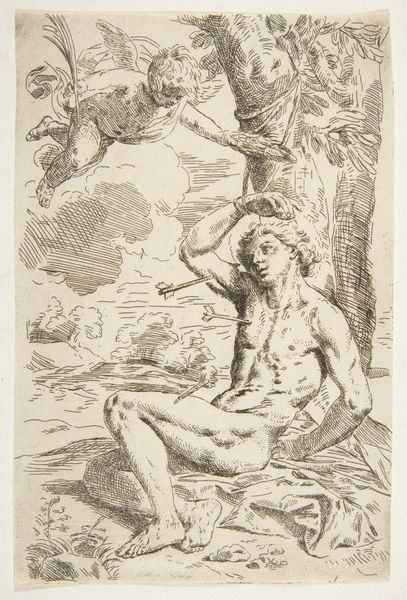 Curator: So, here we have "Seated woman facing right," an etching and print by Giuseppe Diamantini, created sometime between 1660 and 1705. Editor: Wow, it's got a restless energy to it, don't you think? The pose, the quick lines, it feels almost unfinished, like a fleeting thought. Curator: It does possess a sketch-like quality, capturing a certain dynamism inherent in Baroque sensibilities. The subject's vulnerability is amplified by her being alone. One cannot help but consider, where are the others, who is she waiting for? Editor: Yeah, the exposed back almost makes me wince – exposed in so many ways, both physically and emotionally. I wonder about that clump of flowers she’s holding… is it an offering, or is she crushing them? There's definitely something unsettling about it, this push and pull between fragility and a kind of latent power. Curator: That tension, I think, speaks to a fascinating ambivalence around the female form and power dynamics during the period. Is this an idealized nude, conforming to classical standards, or something more subversive? It challenges easy categorization. Moreover, in Diamantini’s work, the figures of women may allude to biblical narratives of sacrifice or resilience. Editor: Maybe that's what makes it feel so contemporary, too, that questioning, you know? The drawing kind of dances around easy answers, which, let’s be honest, is way more interesting than something neat and tidy. It sparks questions, like a poem almost, rather than a definitive declaration. Curator: Indeed, and situating Diamantini’s oeuvre within that broader sociopolitical framework enables us to appreciate the complex layering he achieved. It reminds us of the ongoing need to investigate representations of gender and power. Editor: Definitely. It also reminds me that art doesn't always need to preach, sometimes just holding up a messy, beautiful mirror is enough.