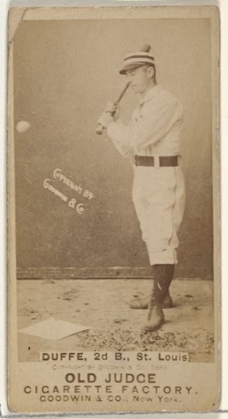 This baseball card was made by Goodwin & Company around 1888, as part of a series of promotional items for Old Judge Cigarettes. It's made through the process of photography and commercial printing, a relatively new technology at the time. What’s striking is how this image intertwines leisure, labor, and consumption. The card features Glasscock, a shortstop for Indianapolis, in a posed action shot. But it was mass-produced, inserted into cigarette packs as a marketing ploy. The photograph itself is carefully crafted to highlight his athletic prowess, designed to capture the excitement of the sport and transfer it to the product. Consider the sheer quantity of these cards that must have been printed and distributed, each one a small, disposable token of a growing consumer culture. There’s a deliberate association being made between the skilled labor of a baseball player and the labor involved in producing and selling cigarettes. This little card shows the beginnings of a system that still operates today, where sports and other forms of entertainment are closely linked to commercial brands. It asks us to question the relationship between our pleasures and the industries that profit from them.