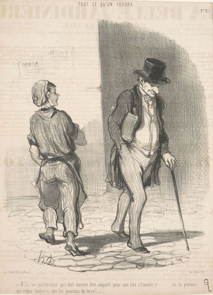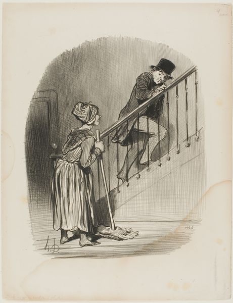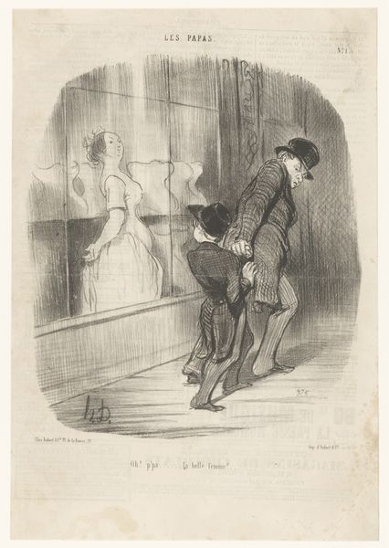 Honoré Daumier made this lithograph, titled "Oh! p'pa... la belle femme!" in 1846. It's a commentary on bourgeois life in France under the July Monarchy, a period defined by its focus on economic prosperity. Here, we see a father and son pausing before a shop window to admire a mannequin. The title, "Oh! p'pa... la belle femme!" suggests the child's innocent admiration, but Daumier uses this simple scene to critique the values of the time. The father, presumably a member of the bourgeoisie, is presented as distracted by the display, perhaps indicating the superficiality of his class. Daumier was known for his caricatures, often published in satirical magazines like "Le Charivari." These prints offer invaluable insights into the social and political climate of 19th-century France. By studying publications like these, and consulting historical archives, we can understand how Daumier used art to critique the social structures of his time, challenging the norms of a society obsessed with appearances and material wealth.
