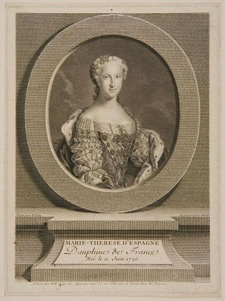 Curator: This is a portrait of Henrietta Maria Adelaide, Duchess of Bavaria, rendered by Karl Gustav von Amling. Editor: The elaborate curls framing her face certainly make a statement. I sense a blend of formality and perhaps a hint of vulnerability in her gaze. Curator: Court portraiture often served specific socio-political functions. Consider how the Duchess's attire and hairstyle broadcast her status and dynastic connections. Editor: Absolutely, and the pearl necklace, those structured curls, they're all symbols communicating power and refined taste. I wonder what personal narratives are hidden behind these carefully constructed images? Curator: The image, as a whole, is meant to project power and the permanence of dynastic legacy. Editor: It leaves me contemplating the complex interplay between personal identity and the demands of her position. Curator: Indeed, the portrait serves as a reminder of the powerful influence of social expectations on individual lives.