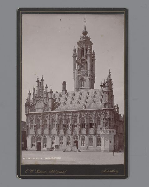 Curator: Ah, here's a curious find! This is “Gezicht op het Stadhuis te Middelburg,” or "View of the Town Hall in Middelburg," captured sometime between 1850 and 1915 by Jan Wendel Gerstenhauer Zimmerman. It’s a photographic print, currently residing at the Rijksmuseum. Editor: Immediately, the sepia tone evokes such a sense of faded grandeur. The paper has aged beautifully; each little imperfection adding character. The image feels still, silent, almost like a dream. Curator: It's realism, absolutely. A straightforward depiction. The photographer really captures the intricate details of the Flemish architecture. I find myself wondering what life was like around this town hall back then. Editor: Notice how the tower, rising high, seems almost aggressively ornate? It reminds me of a bishop's mitre or even a crown. There's an assertion of power, both religious and secular, radiating from that architectural statement. Curator: It definitely speaks of civic pride, wouldn’t you agree? I imagine it served as a gathering point, a place of proclamations, celebrations. A point of collective identity for the community. Editor: Yes, and think about what the architecture tells us about that collective identity. All those windows, perfectly spaced, yet each topped with unique adornments! Uniformity coexisting with individualized expression – isn't that the paradox of community? It suggests societal structures that value both order and creative flourishes. Curator: Good point. I also see, though, in that ordered facade a possible tension between aesthetic perfection and the organic chaos of daily life. A very Dutch trait, this striving for order amid complexity! Editor: And even in its stillness, the photograph carries within it a thousand untold stories. A visual echo of historical whispers and societal rumblings. It feels weighty, dense with unwritten narratives. Curator: Indeed! What initially seemed to be a simple architectural shot reveals a surprising depth. Editor: Quite. A quiet meditation on power, community, and the inexorable march of time, etched in light and shadow.