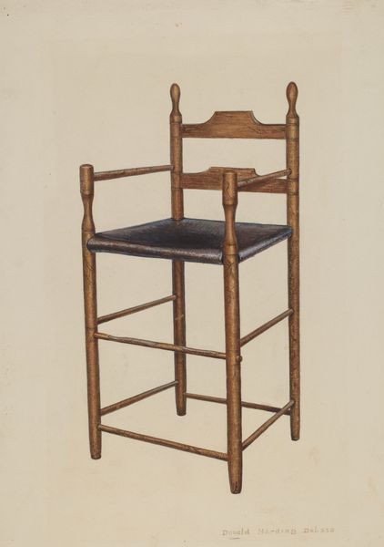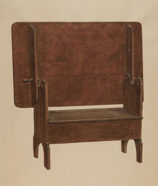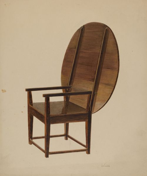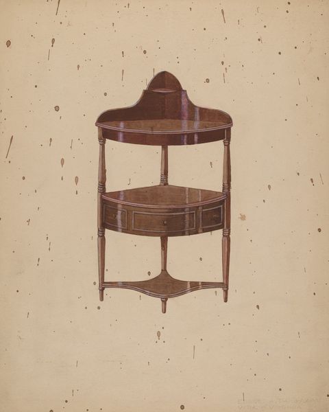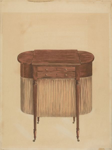 Editor: So, this is Henry Moran's watercolor drawing, "Washstand," from around 1939. It’s surprisingly captivating for a, well, washstand! There's something so meticulously rendered, yet also intimate, about it. What strikes you most when you look at this piece? Curator: It whispers to me of quiet mornings and a different pace of life. It reminds me of my grandmother’s house, filled with the scent of beeswax polish and untold stories etched into every surface. Look closely at the way Moran uses the watercolor. See how the light seems to filter through the wood grain? It's not just about depicting a washstand, but about capturing a feeling, a memory. Editor: I do see that! The almost obsessive attention to detail makes it feel like more than just a utilitarian object. Was there some deeper cultural meaning attached to these items, perhaps? Curator: Perhaps. In 1939, such everyday scenes could also be affirmations of normalcy and beauty during tumultuous times. This washstand, so carefully rendered, speaks of order and domesticity. The symmetry, the clean lines—it’s almost a portrait of a bygone era, don't you think? Makes you wonder about the person who owned it, doesn't it? What stories it could tell… Editor: Absolutely, it's like a tangible link to the past. I’m so glad we slowed down to really *see* this piece. It makes me appreciate how even seemingly mundane objects can hold such depth and meaning. Curator: Indeed. And how an artist can imbue those objects with…well, soul. Next time you’re scrubbing your face in the sink, remember Moran’s washstand, and consider what story *your* everyday objects might tell.