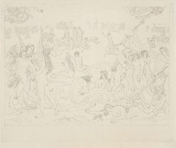 Victor Müller made this pencil drawing of a man pointing to the right, surrounded by followers, at some point during his career in Germany. The image evokes ideas of leadership, progress, and the pursuit of a better future. Looking at the cultural context in which Müller lived and worked, the image creates meaning through several visual and historical references. Müller worked in Frankfurt during a period of great social and political change. Germany was still a fragmented nation with many independent states and a rising sense of nationalism. The drawing seems to visualize this nationalistic spirit. The mix of historical and allegorical figures could symbolize the collective German people, united in their pursuit of a common goal. The figure pointing into the distance would then embody the progressive spirit of the era, suggesting that the German people were ready to embrace modernity and assert themselves on the world stage. To fully understand this work, further research into Müller's influences, the political climate of Frankfurt, and the role of art institutions at the time would be invaluable.