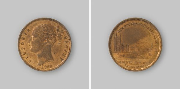 Curator: This medal, designed by Francis Massonet in 1877, commemorates the World’s Fair at the Palais du Trocadero in Paris. Made of metal, it uses a relief technique to depict both the Parisian coat of arms and the exposition itself. Editor: It has a stately feel to it, doesn’t it? Both sides feel very… proper. Look at the cityscape! Such a tiny world captured there. Curator: Yes, it’s fascinating how civic pride intertwines with global display here. Consider how these World's Fairs, framed through the lens of 19th-century Neoclassicism, were platforms for projecting national identity and colonial power, subtly reinforcing hierarchies under the guise of international exchange. Editor: Right. There's definitely a sense of controlled grandeur…a celebration of progress that, of course, also has these undertones we can't ignore now. The metalwork itself—it's not just documenting the fair, it’s a little monument to the era, right down to the choice of gold finish. A bold claim about the permanence of achievement, maybe. Curator: Absolutely. Think about the intended audience, too: likely affluent Parisians or international visitors. Owning such a medal became a way of possessing a piece of this curated narrative. Medals like these circulated ideas and values, and contributed to the myth-making surrounding events like the World Fair. Editor: You’re right. Imagine slipping this into your pocket as you wandered those grand halls. "I was there," it whispers. And it reminds me – it's always a choice, isn't it, what stories we choose to tell, which glories we decide to strike onto gold. Curator: Precisely. These objects prompt crucial questions. Who benefits from these portrayals of progress, and whose narratives are marginalized or erased? It encourages a nuanced dialogue between historical triumph and enduring critique. Editor: Well, now I want to find the stories buried beneath the shine! This little disk, it turns out, has big things to say. Thanks for shaking things up! Curator: My pleasure! History isn’t just dates and events, it’s about excavating these stories and understanding the impact they have on our present.