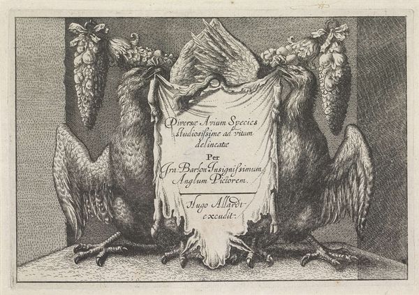 Curator: Here we have Albert Flamen's "Seascape with border of marine animals and a fishing net," created around 1664. It’s a Baroque engraving. What catches your eye initially? Editor: Okay, that's wild. My first thought is... whoa, this print is both strangely beautiful and slightly unsettling. I'm struck by the contrasting elements—serpentine, monstrously embellished sea creatures frame a placid seascape, giving it this surreal and captivating edge. Curator: The baroque loved that tension. It's fascinating how the sea creatures act as gatekeepers to the scene within. Marine animals and nets evoke the ocean's abundance and potential danger, both sustained and threatened by humanity. They embody that duality in visual form. The serpents may be symbolic of change and rebirth but the marine creatures—with mouths agape—holding a fishing net feel more predatory. Editor: Yes, definitely gatekeepers, but with… attitude. The way those animals grasp that net seems almost territorial, or maybe even protective of the idyllic scene behind them, while also being menacing. They draw you in with their gaze but almost dare you to proceed into their watery world. The ship appears tranquil, oblivious. It makes me wonder about unseen realities that our idyllic scenes may obscure, as if daring us to plunge into the abyss to know. Curator: And you can read those nets several ways. They trap, they define—and the same material protects that central scene from outside forces. A potent cultural symbol repurposed as part of the piece. Editor: It also suggests this relationship of man, ship, the marine creatures, the open seas, this dance—it is contained in a very specific frame. The work becomes, almost, about capturing the whole world in this tiny tableau. How are our definitions imprisoning, even killing, our subjects? Or what needs protection? It has made me rethink our reliance on definition! Curator: Exactly. It gives you so much to think about the relationship we have with the natural world—and to examine that frame, both literally and conceptually. Editor: Well, that was a great plunge into some deeply layered historical context. I think I need to look at that ship again.