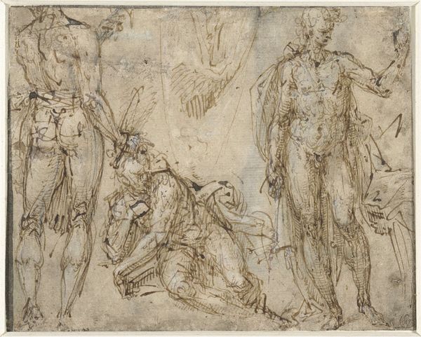 Curator: Let's take a look at these "Figure Studies," a charcoal drawing by Federico Barocci. The artist was an Italian Renaissance painter. It’s intriguing to observe Barocci’s preparatory exploration here. Editor: My first impression is one of intense observation. There’s a sense of struggle or perhaps contemplation in these figures, their bodies rendered with such careful attention to musculature and pose. What can you tell me about the social climate from which Barocci was drawing from? Curator: Barocci, active during the late Renaissance, was influenced by the Counter-Reformation, so art was meant to inspire piety and religious devotion. While these are figure studies, they reflect an interest in depicting the human form realistically to serve religious messaging. Editor: So, considering this drawing through the lens of religious and social expectation, the figures challenge traditional power structures of the time? Do they invite critical reflections on these expectations? Curator: To an extent. While Barocci wasn't overtly rebelling, he did move away from the idealized forms of the High Renaissance. The rawness of these studies could reflect a search for greater emotional truth and human vulnerability. The choice of charcoal further emphasizes this more personal and immediate engagement. The softness and flexibility of charcoal allow for experimentation in shading and texture that would have likely been absent from ink or paint mediums, giving them an individual expression. Editor: It feels as though the medium is a rebellion of sorts, when juxtaposed to the political themes you are bringing up. There is a push and pull of established norms, a very clever observation on Barocci’s artistic liberties within the greater historical and artistic landscape. Curator: The way Barocci depicts movement and the interplay between light and shadow shows he wasn’t confined by the artistic standards of his period. He foreshadows aspects of Baroque dynamism. These figures might have been experiments for painting composition in a time when paintings often featured less emotive and dynamic portraits. Editor: Seeing these figure studies, in terms of how art serves specific socio-political purposes and even foreshadows a new movement of creative freedom of expression, really broadens my understanding and appreciation. Curator: Absolutely, examining artworks like this, considering artistic expression in conversation with historical context gives us a more complete understanding of how historical constraints challenge societal progress through different mediums.