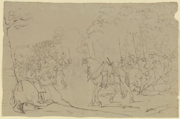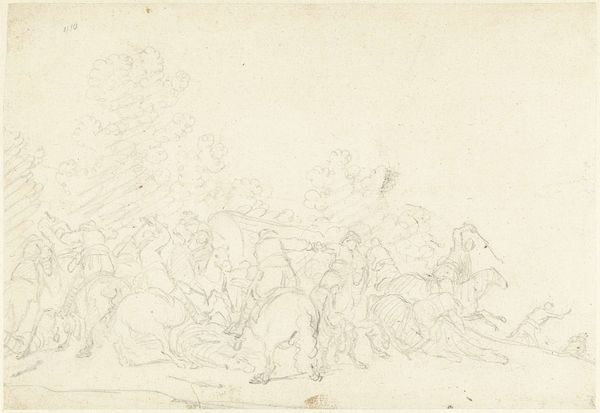 Winslow Homer created this pencil sketch, "End of the March," on a small sheet of paper, capturing a scene likely from the American Civil War era. The drawing depicts a group of figures, possibly soldiers, at the tail end of a march, their forms rendered with loose, hurried lines. Homer's choice of subject matter places this work within the context of a nation grappling with profound social and political upheaval. He worked as a freelance illustrator, and many of his images dealt with the war. Given the time in which it was produced, such images played a crucial role in shaping public perception. To fully understand this sketch, one must delve into the history of the Civil War, its causes and consequences, and the complex social dynamics of the period. Archival materials, such as letters, diaries, and newspapers, can offer invaluable insights into the experiences of soldiers. Understanding the institutional landscape of the art world at the time is also helpful: were images like this promoted by magazines and galleries? Ultimately, the meaning of this artwork is contingent upon its historical context.