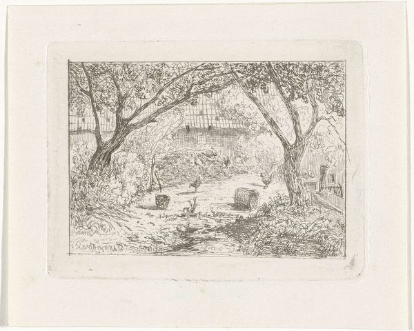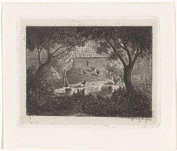 Editor: This is Joseph Hartogensis' "Boerenerf met kippen" from 1855, an etching depicting a farmyard scene. It feels quite dense and almost claustrophobic, with so much detail packed into a small space. What do you see in this piece, beyond the chickens of course? Curator: Ah, yes, the chickens! They are utterly charming, aren’t they? This etching draws us into a private world, doesn't it? It’s as if Hartogensis is inviting us to share in a secret, perhaps a nostalgic memory of rural life. For me, it speaks of simpler times, where life was more connected to nature. But the density you mentioned, I see it as a sign of abundant life, bursting forth from every corner of the scene. Editor: That's interesting. I initially saw it as almost cluttered, but the idea of "abundant life" gives me a different perspective. Is that sense of abundance something specific to Dutch Golden Age art or realism, perhaps? Curator: Possibly a blend of both, actually! The Dutch Golden Age often celebrated the everyday, but realism really emphasizes a true and honest portrayal, not idealized, a true sense of documenting life as it is, a "warts and all" portrait. It could even reflect Hartogensis' state of mind, maybe capturing a fleeting emotional truth, like the memory of my own beloved, somewhat messy garden... what does it trigger in you now? Editor: I think it feels more intimate now, less like a general scene and more like a personal reflection. It's made me appreciate how a seemingly simple image can hold so many layers of meaning. Curator: Exactly! Art has that incredible capacity to reflect not only the external world but the internal landscape as well, revealing truths about ourselves in the process. Thank you for letting me see this through your lens, which enriches us all.