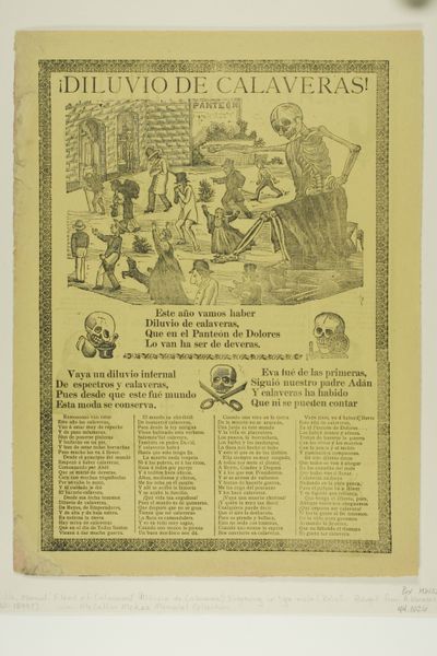 Curator: Let's take a moment to observe this fascinating print entitled "Con las suegras, poco y bueno," or "With the Mother-in-Laws, Little and Good." It’s by Manuel Manilla, and while it doesn’t have a specific date, we believe it originates from the late 19th century in Mexico. The print combines etching with typography on paper and resides in the Art Institute of Chicago's collection. Editor: It has such a strong graphic impact! The overall design, the busy layout—it evokes a sense of both folklore and social satire. There’s a stark duality between the written text and the roughhewn visual narrative above. Curator: Exactly! Manilla was known for his use of "hojas volantes," or broadsides, like this one, which circulated popular stories and social commentaries to a wide audience. The visual component of this example reflects strong currents of Mexican Muralism. It acted as a visual language accessible to everyone, despite their literacy level. Editor: Yes, I’m particularly drawn to the image at the top: it's seemingly a vignette depicting domestic strife—a daughter shielding her husband from a mother figure, while on the other side onlookers gesture and seemingly egg-on some physical altercations with bystanders nearby. There’s an underlying dark humor and clear suggestion of difficult familial relationships that persist across cultures. The symbolic weight of mother-in-law relationships is certainly palpable here! Curator: Absolutely. Manilla was really commenting on those everyday struggles but he was not beyond caricature. Notice also that above and below are rhyming verses, essentially acting like captions. In doing so he reinforced the didactic point for audiences, who perhaps chuckled and pondered the complex relationships illustrated here. It's about social norms and tensions within families—the universality of which probably contributed to the artwork’s broad appeal. Editor: It's quite brilliant how he manages to pack in a whole world of cultural symbolism and social commentary into one sheet of paper. One has to imagine just how many copies were made, distributed, and tacked up around the community—visuals and rhymes sticking with people long afterwards. Curator: It really encapsulates how art can serve a vital function outside the museum, acting as both entertainment and social commentary, a true mirror to society. Editor: A small page holding centuries of shared cultural understanding. Remarkable.