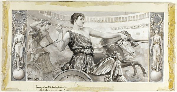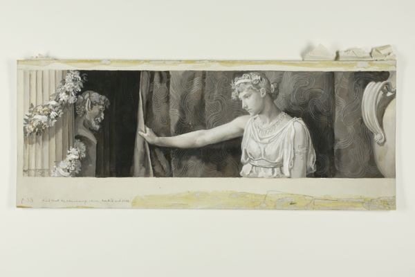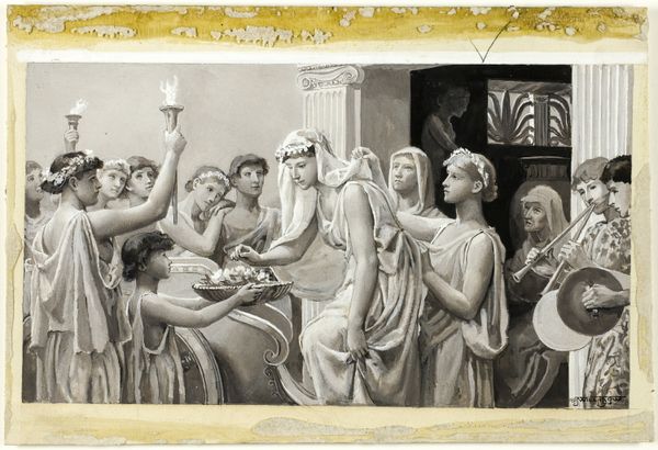 Curator: Here we have Will Hicock Low’s "Checking His Love Trance, a Cup He Took Full Brimm'd," dating back to 1885. It's a drawing primarily using gouache, watercolor, and charcoal on paper, now held at the Art Institute of Chicago. The muted tones give it such a melancholic air, don’t you think? Editor: Absolutely. There's a real sense of quiet desperation emanating from the figures; they appear caught between indulgence and apprehension. It speaks to larger issues of societal roles and the pressures surrounding idealized love during the late 19th century. Curator: Focusing on materials, the layered applications of watercolor and gouache create a remarkable depth, juxtaposing transparent washes with more opaque areas, achieving textures almost sculptural. It makes me think of how industrialization allowed easier access to art supplies. Were these more commercially available than earlier pigments or dyes? Editor: A very astute observation. Cheaper and more accessible pigments definitely democratized art making. In the context of the Gilded Age, where conspicuous consumption was rampant, consider the gendered dimensions of art-making: who had access to leisure, materials, and training? These seemingly classical figures echo earlier representations but are also complicit in reflecting contemporary social anxieties. Curator: Indeed. Notice the rendering of fabric and flesh. Low really exploits the properties of charcoal and gouache to suggest texture and form. There’s a palpable interest in realism even within the idealized, romantic context. How does the setting itself feed this discussion? Editor: The quasi-classical setting with its suggestive ornamentation and incense contributes to a carefully crafted environment meant to signify luxury and a retreat from the harsh realities faced by much of the populace at the time. Their privileged isolation only serves to amplify the underlying unease. Do they truly love each other, or is this a performance for societal consumption? Curator: Looking again at the materiality, I think about the physical act of creation – the artist blending the paint, carefully applying it, the marks of the charcoal... It all speaks to the artist’s own labor and skill. Editor: And thinking about contemporary consumption patterns, that act of "checking his love trance" highlights a consumerist approach to relationships, mirroring the transactional ethos pervasive then. Are these figures consumers of art, consumers of love, or both? It compels us to critically analyze art, romance, and societal expectation in that period. Curator: It’s quite powerful how Low uses these seemingly delicate mediums to engage with complex questions. I will see it in another way now. Editor: Precisely. The layers of art history, social critique, and medium specificity yield endless reinterpretations. A good moment of considering representation in art, wouldn't you say?