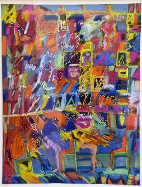 Curator: What an exhilarating explosion of color. My first impression is the sheer energy conveyed here, the overwhelming sense of a crowded space captured with frenetic brushstrokes. Editor: Indeed. Today we're looking at LeRoy Neiman’s “Toots Shor Bar” painted in 1975 with acrylic on canvas. Neiman was known for his vividly colored, gestural depictions of sporting events and social gatherings. Curator: And this particular gathering spot, Toots Shor's, was a New York institution, a place where celebrities, sports figures, and journalists all rubbed shoulders. It really was the intersection of so much masculine power and fame at that time. The painting gives us a lens into that mid-century celebrity culture and its role in shaping American identity. Editor: Focusing on the artistic execution, I’m struck by how the composition, chaotic as it may seem at first, manages to guide the eye. The curve of the bar dominates the lower half, drawing us into the throng of figures above. There's an almost cubist flattening of space, yet it still feels undeniably like a bar scene. Curator: Exactly! Think about the racial dynamics present, who had access to these spaces? The performative aspects of celebrity culture? These are very pointedly about *exclusion*. Editor: Agreed, but note how the bold colors and energetic lines, reminiscent of Fauvism, don’t quite allow for nuanced interpretations of character. Instead, we have a distillation of raw energy and vitality. Curator: I think, rather, this work serves to highlight the exclusionary politics embedded within celebrated institutions of mid-century America and its effects in shaping public perception of “fame.” Editor: I appreciate how your reading brings a critical eye to the work's socio-historical context. From a formal perspective, it demonstrates an unusual marriage of gestural abstraction with figuration, all working toward a very successful and evocative end. Curator: And it reminds us of whose stories were considered important and worth depicting. Editor: A crucial perspective, underlining the painting’s complex resonance, don’t you think?