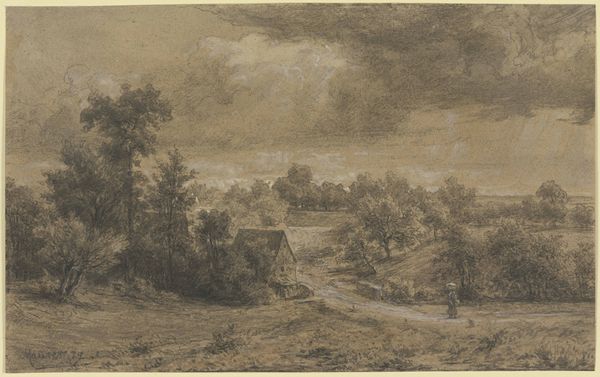 Curator: There's an almost unsettling quiet in Alphonse Legros' "View of a Farm, 2nd plate." The print work is so dense, it almost feels overgrown. Editor: I agree. It gives me a sensation of being deeply secluded, almost hidden, maybe with a sense of lurking? Curator: Exactly. Legros worked in the Realist tradition. This etching shows us, I think, the everyday experiences of rural life and a very intentional naturalism. I’d even argue that the "unsettling" nature we sense is perhaps more about the shift from idealized pastoral landscapes. Editor: Yes, because if it had depicted perfectly manicured fields and idealized peasants, that certainly would speak volumes, no? It is about how these images enter into cultural memory and remind us of this idea, for me at least, about the way realism serves to expose societal myths. The shadow across the lower register feels heavier, thicker than necessary. Curator: And the texture of the foliage is really pronounced thanks to the etching technique. Every little line is creating depth and a certain energy in a way no photograph ever could. You notice how the composition is almost swallowed by this intensity. Editor: How this etching differs from the visual shorthand or grand scale of earlier historical painting. In many ways it captures a modern relationship between art and subject, not a romantic one. Does that read politically for you at all? Curator: I’d say yes. While subtle, I’m reminded that many Realist painters used their art as a form of social commentary, addressing poverty and labor in the 19th century, though the direct politics aren’t entirely obvious in this landscape scene alone. Editor: In that sense, it does embody a cultural perspective shifting towards portraying things as they were actually experienced, perhaps as part of this larger shift away from older Romanticized notions about history and pastoral experience. It reminds the viewer of what they’re looking at in relation to themselves. Curator: Exactly, what does one expect of landscapes like these, of images of farms, or how one approaches a visual understanding of a common rural theme that one does or doesn’t participate in? It speaks so softly. It resonates long after you’ve moved on.