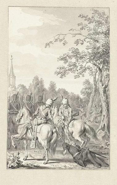 Editor: So, this is “Ruiter geeft een bedelende jongen munten,” or “Rider Giving Coins to a Begging Boy,” an engraving by Reinier Vinkeles, created around 1806-1807. It’s quite striking, this sharp contrast between the mounted riders and the beggar. What narrative layers do you see within this composition? Curator: I see the embodiment of societal disparity, certainly. Beyond the immediate scene, consider the enduring symbolic weight of the horse and rider throughout history. Traditionally, it represents power, control, nobility even. Here, it's juxtaposed against the image of supplication, amplified by the child. Doesn't the child’s posture remind you of religious iconography, almost a reversal of the Madonna figure? Editor: That’s a fascinating point. I hadn't thought of it in those terms. Are you suggesting that the image subtly critiques the power dynamics? Curator: Indeed. The gate behind the riders suggests exclusion and privilege, a boundary reinforced by their elevated position. The figures themselves become symbolic actors. Is it charity, or merely a performance of benevolence for their own image? Vinkeles offers no easy answers, inviting us to confront uncomfortable truths about social responsibility and power. Do you think the choice of engraving reinforces the contrast between the two social situations in any way? Editor: Maybe, yes. The sharp lines of the engraving definitely amplify the visual distinction, setting up a visual division as if to keep the worlds separate. I will have to study Vinkeles's other engravings. This was insightful, thanks. Curator: And for me as well. Consider how prevalent this imagery is throughout art history, and ask yourself: what has really changed? The visual vocabulary continues to resonate.