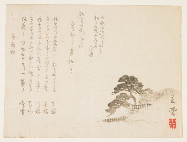 Okabe Nampo produced this print of a farmhouse and trees at an unknown date using woodblock and ink. It exemplifies the traditional Japanese art form of Ukiyo-e, or "pictures of the floating world." Ukiyo-e emerged during the Edo period, from the 17th to 19th centuries, when Japan experienced relative peace and prosperity. This allowed for a flourishing urban culture, particularly in the pleasure districts. The art, commissioned largely by the merchant class, often depicted scenes of everyday life, landscapes, and popular entertainment. The image creates meaning through visual codes and cultural references related to the natural world, such as the trees and pastoral architecture. The script, known as calligraphy, also represents a cultural tradition. To understand this work better, we could research the Edo period and the role of Ukiyo-e in reflecting its social values. Art history emphasizes the social and institutional contexts that shape artistic production and the way that we view art over time.
