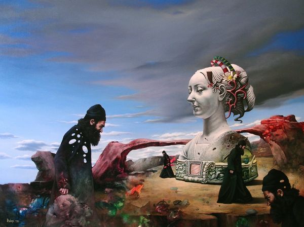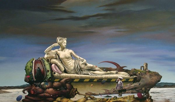 Dragan Ilić Di Vogo made this painting, called 'Hvala ti – Thank you' and I find the layers of meaning in this piece really engaging. It almost feels like the artist had to work through so many ideas before deciding that this was "finished." Look closely, and you'll see this isn't just a straightforward representation of Michelangelo’s David. It’s a David that is crumbling, literally falling apart in places! The way Di Vogo renders the cracks and fissures, it’s as if time itself is eroding this iconic figure. And then there's the splash of blue on David’s shoulder – a defacement, a mark of our times. But that splash also introduces a jolt of unexpected color within the work, a note of the artist’s hand within this otherwise classical scene. You can see a lot of art historical precedents here – Surrealism, maybe some Neo-Classical stuff – but ultimately it stands on its own two feet. It reminds us that art history is a conversation, and it’s one that’s always being rewritten.