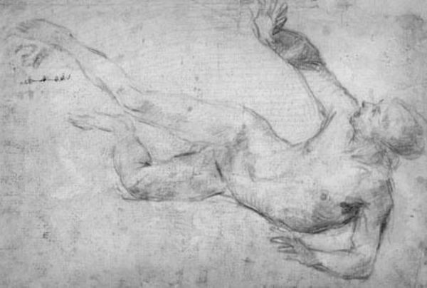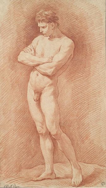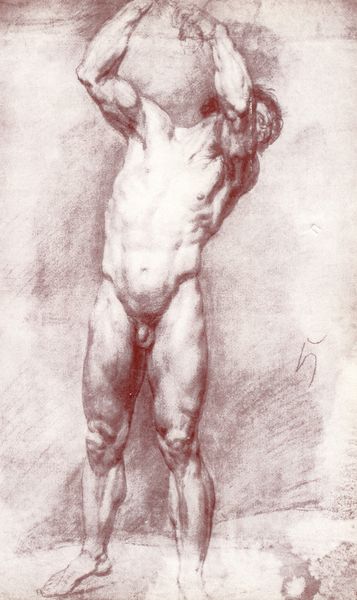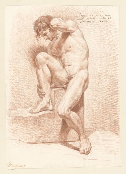 Editor: Here we have Alessandro Gherardini's "Seated male nude with a staff, turned to the left," created in 1691 using pencil. The first thing that strikes me is the sheer detail achieved with just pencil, and the pose seems so dynamic, almost like the figure is about to move. What’s your take on this drawing? Curator: Dynamic is spot on! To me, it whispers of potential. That upward reach, the muscular tension…it's not just a nude, it's a story held within lines. Gherardini’s got this way of hinting at narratives without explicitly stating them. It's almost like we're glimpsing a private moment of reflection, perhaps a model in rest, and the seemingly arbitrary presence of the staff turns it into an emblem of contemplation. How does the medium affect your experience? Editor: I hadn’t thought of it as a moment of reflection; interesting. Because it's pencil, it feels very immediate and raw. Like we are seeing a sketch, so the intention might be very focused on practice and less on telling a narrative, maybe? Curator: Exactly! Pencil invites intimacy. It is immediacy! We get that peek into the artist's process – the searching lines, the corrections…it humanizes the Baroque, doesn't it? And isn’t it funny how something so seemingly simple can hold so much depth? Editor: It’s making me appreciate sketches a lot more – I thought they were just preparation! I’ll never see pencil drawings the same way again. Thanks! Curator: That's the joy of looking closely, isn't it? Everything, even a fleeting sketch, can reveal worlds if you allow it to.