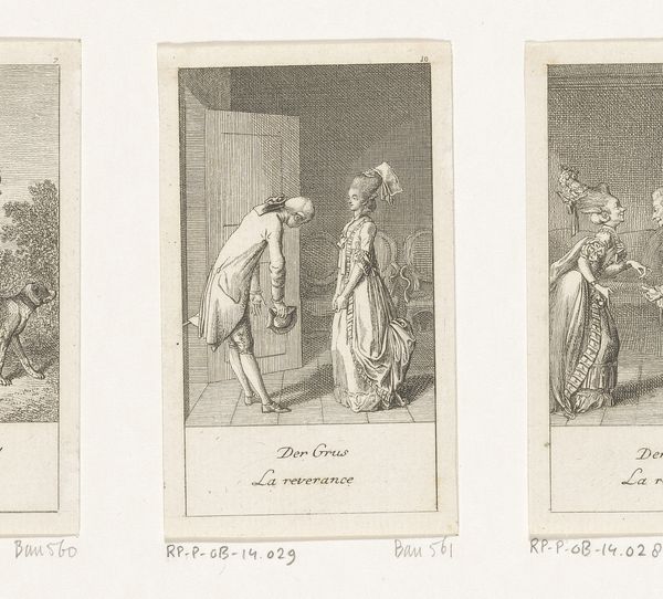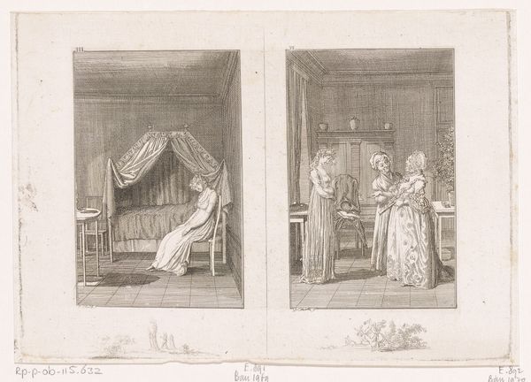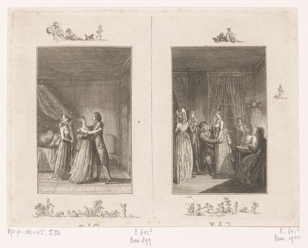 Editor: This engraving, created by Daniel Nikolaus Chodowiecki in 1798 and titled "Twee voorstellingen uit de verhalen van Wilhelm Gottlieb Becker," features two scenes side-by-side. The delicate linework creates an intimate, almost stage-like feel. How might these scenes reflect the social currents of the time? Curator: Given its late 18th-century origins, it's worth examining how Chodowiecki uses these images to comment on societal values. Consider the emphasis on domestic scenes. What power dynamics are at play in these enclosed settings, and how might that have resonated with the public audiences engaging with such prints? These were times when ideas of sensibility and virtue were highly valued, shaping both personal behavior and artistic representations. Editor: So, are you saying it is important to think about this piece beyond aesthetics? Curator: Exactly! It's about interrogating the institutions that elevated this style of genre painting. Who commissioned these works, and what messages were they meant to convey about the roles of women, the nature of domesticity, and the proper way to conduct oneself in society? Printmaking allowed these images to circulate widely, shaping and reinforcing specific societal norms. Editor: That’s fascinating! I hadn’t considered the social impact a seemingly simple engraving could have. Curator: Furthermore, think about the Rijksmuseum acquiring and displaying this work centuries later. What does its presence in a national collection say about our current understanding of the past? It invites us to consider how historical narratives are constructed and the evolving role of art institutions. Editor: Thinking about how these images move through time makes them all the more engaging. I see so many potential stories within. Curator: Precisely. The social life of this engraving is far from over.