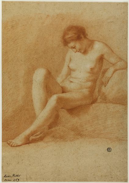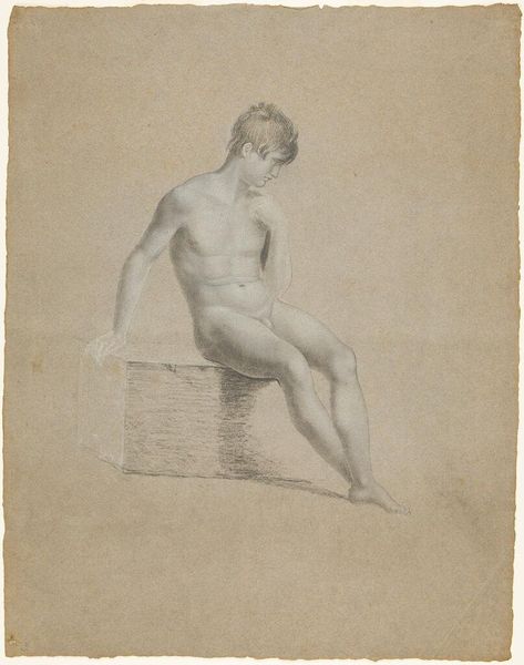 Editor: This is Washington Allston's "Profile View of a Nude Youth Seated on a Block." It's undated, but Allston lived from 1779 to 1843. The drawing has a serene quality, almost melancholic. What draws you to this piece? Curator: It feels like a whispered secret, doesn't it? The young man seems lost in thought, a perfect embodiment of Romantic introspection. Allston, a master of light and shadow, uses the monochrome medium to amplify the feeling of introspection. What do you make of the figure's posture? Editor: It’s relaxed, but also closed off. Almost like he’s guarding something. Curator: Exactly! It reminds me of my own youthful ponderings. What truths or untruths is he confronting? A sketch like this invites such projection, and that's part of its enduring magic. It is a reminder that we all contain multitudes, even in moments of quiet contemplation.
