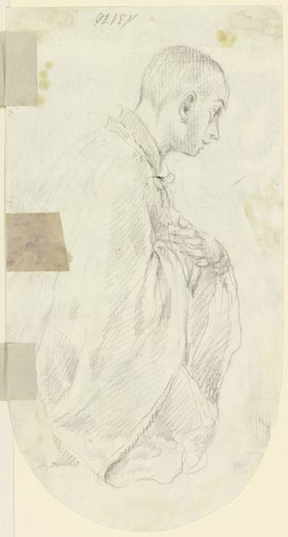Editor: This is a drawing entitled "Rugfiguur van een priester," or "Figure of a Priest Seen from the Back," made between 1594 and 1615 by Giovanni Andrea Ansaldo. It's a pencil drawing on paper and it strikes me as both detailed and somehow unfinished. What do you see in this piece? Curator: Immediately apparent is the artist's emphasis on line. Note the economy and precision with which Ansaldo captures the texture and weight of the priest's garments. Consider the layering of these lines, building up areas of shadow and suggesting volume. The colour of the paper too, becomes as crucial to the visual composition as the artist’s actual marks. What relationship do you see between the figure and the negative space of the background? Editor: I see how the pale blue colour is almost as present as the figure, but it also flattens the image. If the paper was a dark tone, the priest could be emerging from the gloom, rather than seemingly etched onto the surface. It makes the folds in the robes stand out a bit more because they contrast less than the empty space. Curator: Precisely! The artist consciously uses this tonal relationship to focus our attention on the formal elements: the interplay of line, shape, and texture. The lack of facial features compels us to dwell on the purely aesthetic qualities. Can you detect ways that the shapes created by folds are balanced through the figure’s body? Editor: It feels like the wider curve of the upper sleeve, on the figure's left, is repeated by the fabric bunched around the ankle. Also, it's interesting to consider why the artist has given much more attention to detail in the bottom third of the garment. I mean, those tassels, wow! Curator: A telling observation, especially on a quick drawing on paper. Ansaldo seems invested in inviting you, the viewer, to truly analyze the material composition of the cloth depicted. Ultimately, we've been exploring not simply a representation of a priest, but a self-conscious study in form and materiality. Editor: I hadn't considered how the artist guides your gaze in this sketch! This exploration was illuminating.