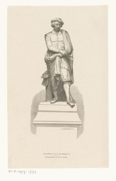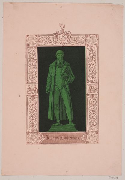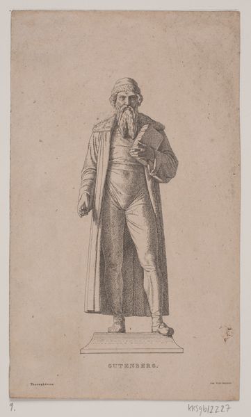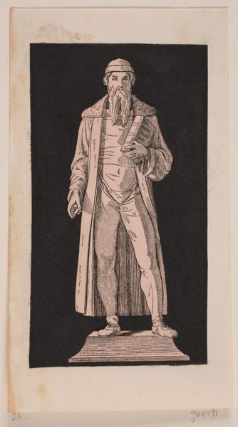 Curator: This is Andreas Flinch’s "Johannes Guttenberg," made sometime between 1813 and 1872. The piece is a woodcut print currently housed at the Statens Museum for Kunst. Editor: There's a compelling austerity to this piece. The stark contrast of the figure against that dense, black background, emphasizes the linear quality of the cut. The lines give it a real tangible presence. Curator: Absolutely, let’s consider the material and its relationship to the subject. Flinch used the woodcut, a printmaking technique involving carving an image into a block of wood, inking its surface, and then pressing it onto paper. The choice of the medium seems particularly appropriate here given Guttenberg’s revolutionary developments in printing. The proliferation of the printing press meant not only was literacy able to spread throughout the world more, but artists and thinkers were able to explore their creativity as well. Editor: That’s a fascinating point about the connection between the medium and the man. Thinking about the context—museums often play a crucial role in shaping our understanding and elevating specific artistic and intellectual figures, wouldn’t you say? Images like this became so pervasive because of institutions preserving and sharing the history of such notable inventions like the printing press and in turn, people like Guttenberg. It’s all intrinsically connected. Curator: Right, it prompts a critical examination of the choices we make about labor, material, and meaning. Here the artist represents a person vital to this type of artistry; there is the production and consumption of books as commodities, and access to mass knowledge. I wonder about how such a person is consumed by the audiences throughout the decades since. Editor: It really makes one think about access, impact, and who decides whose image should endure. The piece compels a recognition of how powerful institutional validation and memory are for society as a whole. Curator: Indeed, an enduring figure rendered in a medium integral to his lasting influence. It creates this cyclical connection between artist, subject, medium, and cultural legacy. Editor: Exactly, thinking through this work reminds us how vital artwork is, and how crucial are the socio-political conditions of our time.