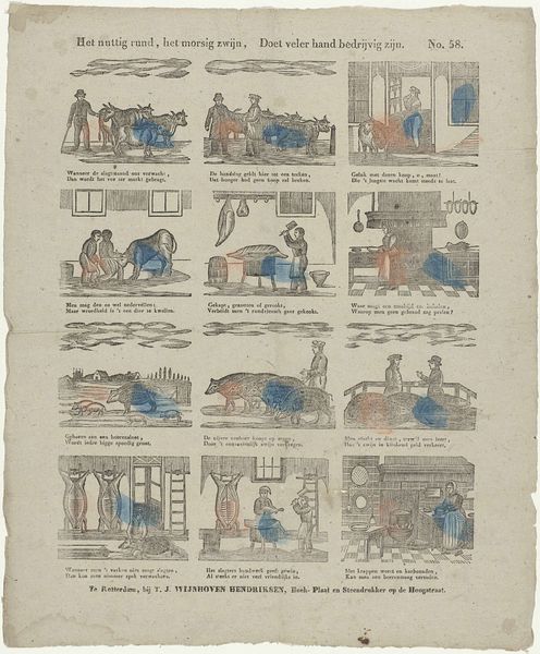 Curator: Let’s consider this charming print titled "Dat gij, ô jeugd! in deze print, / Alhier u zelve spelend vindt!", created sometime between 1811 and 1829. Editor: My first thought is that it reminds me of a children’s book illustration. There's a lighthearted feel to it, even with those rigid rectangular boxes containing each vignette. Almost like an early precursor to comic books? Curator: Indeed. The work offers a glimpse into the genre-painting traditions of the Dutch Golden Age and how they were evolving. As a print, we can consider the production and accessibility. This piece would have been produced for wider distribution than an unique painting, aimed perhaps at educating children? The print itself could be understood as a common or even pedagogical object. Editor: It makes me wonder who the intended audience was. Was it simply for children, or perhaps parents who would have used the narratives depicted to reinforce certain values? I see what appears to be punishment inflicted in the squares as well, not unlike morality tales. The inscription suggests that the "youths find themselves at play". It really grounds this piece in its socio-historical moment, highlighting education. Curator: Absolutely, it gives voice to the silent narratives of ordinary children within these settings. Each vignette seems carefully crafted to reveal distinct power dynamics – class, familial bonds, and so forth. It raises relevant questions of agency. Consider too how gender is being coded in each framed scene... Editor: Examining this through the lens of printmaking, one wonders about the engraver's craft, what type of press produced the images, the inks used for coloring. Even though this example is located at the Rijksmuseum, in that period I would propose this to be viewed closer to a form of folk art. And the print itself, a form of democratization! Curator: Viewing it in that perspective casts new light on it, transforming the way it resonates with viewers across historical strata. Editor: And emphasizing, as it were, art's entanglement within systems of labor, circulation, and access.
