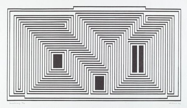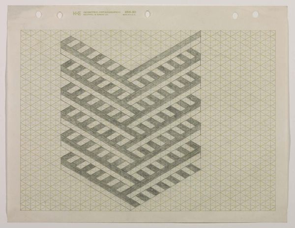 Curator: Right, let’s spend a moment with Josef Albers' "Graphic Tectonic," created in 1941. It’s a print that really plays with line and form in such an interesting way. Editor: My first thought? It’s utterly hypnotic. Like looking at a blueprint for a building that could only exist in Escher’s wildest dreams. The interplay of lines just grabs your attention. Curator: Albers was a key figure bridging the Bauhaus tradition with American modernism. This work reflects his engagement with geometric abstraction. There's this underlying grid, and on top of it, we see this complex pattern unfolding… almost like a maze. It has op-art elements, don’t you think? Editor: Absolutely! It's almost unsettling, isn't it? The more you look, the more the lines seem to vibrate. I get this sensation of depth where there is none, which makes me think about perspective as a tool to shift realities on paper. Like Albers wants us to question what is actually there. Or is he creating pathways in our minds? Curator: That’s interesting, thinking about pathways and the idea of navigation within the piece. Albers began to formulate his influential color theories around this time, and although "Graphic Tectonic" is monochrome, you can see his core principles of exploring visual perception already emerging. There’s such meticulous control here, even within apparent simplicity. Editor: Meticulous, definitely. But what's amazing is how it doesn't feel cold or sterile. It has soul, which pulls me in. You almost expect the lines to start moving, maybe even rearrange themselves right before your eyes! Curator: It speaks to the potential energy held within minimalist form, doesn’t it? This was created during a turbulent time, just as World War II was escalating. There's a fascinating tension in this tightly controlled structure – a sense of order amidst chaos. Editor: True. And I’m struck by the idea that maybe within constraint – in the face of chaos as you put it – real creative possibilities take hold. “Graphic Tectonic” sort of screams that paradox, you know? Curator: I agree. It encourages you to think, not just look. It's a work that lingers in your mind. Editor: Yes, a maze I think I’ll revisit.