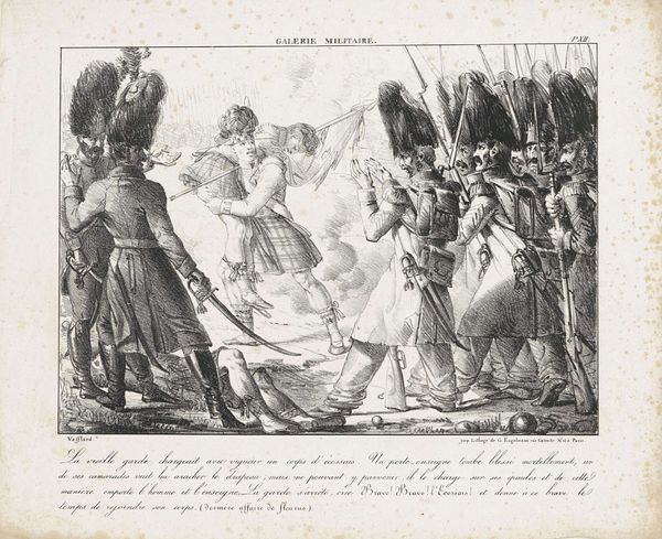 François Grenier made this print called 'Death of the French Captain in Oostkapel' in 1793. Here, the fallen captain, with arm outstretched, guides his troops. This gesture, a legacy from antiquity, echoes through time. Consider the Roman emperors, their arms raised in command. This motif transcends its origin, reappearing in Renaissance paintings and beyond, each time imbued with power and authority. Yet, here, it is tinged with tragedy; it marks not triumph, but a final act of leadership. The very act of pointing directs the viewer's gaze and evokes a primal, almost instinctual response. It connects us to the battlefield, making us witnesses to the event. This symbol, however, doesn't end here; it resurfaces, evolves, and takes on new meanings across time.
