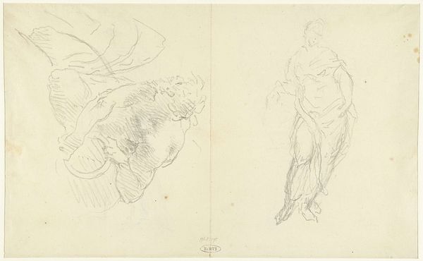 Here we see "Two Sketches of a Woman and a Warrior" rendered in delicate strokes of graphite on paper by Dionys van Nijmegen. The composition divides the figures into two distinct studies, each a testament to the artist's anatomical observation. Note how Van Nijmegen uses line to evoke form and volume in the classical figures. These lines dance across the surface, defining drapery and musculature, creating a sense of movement and energy. Despite their unfinished nature, these sketches present a study in contrasts – the soft curves of the woman versus the angular stance of the warrior. This contrast is not merely aesthetic but speaks to deeper, semiotic structures relating to gender and power. The deliberate asymmetry and the sketched quality invites us to consider how the unfinished can be as compelling as the complete. It’s a challenge to traditional notions of artistic perfection and a suggestion that the process of creation is as significant as the final product.